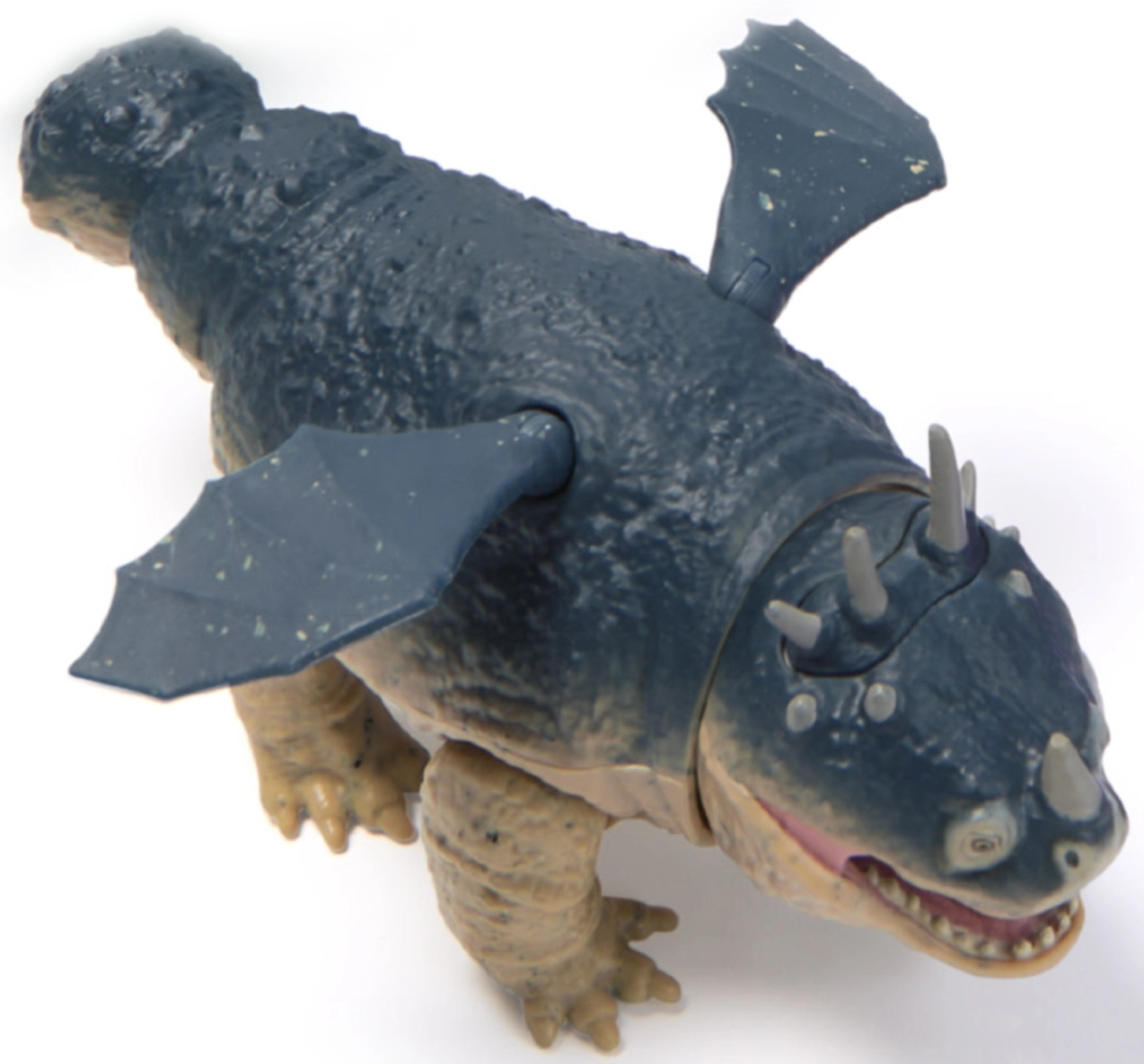 A részletes, „köves” pikkelytextúra, a szarvak és a nyitott, agyaras száj hűen idézik az ÍGY NEVELD A SÁRKÁNYODAT világát.