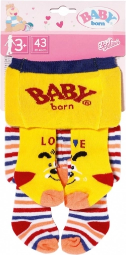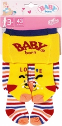 Baby Born harisnya egy csomagban kínál kényelmet és stílust, játékos mintákkal kiegészítve. Benno nyuszi és Bello kutyus motívumai garantáltan elnyerik a gyerekek tetszését. Az első páros a rózsaszín és kék kombinációja: Benno integet a rózsaszín harisnyáról kék konfettivel, valamint nyuszis minta a kék csíkos darabon. A második páros napfényes sárga és színes csíkos harisnyát kínál kutyusos képpel.