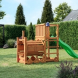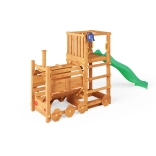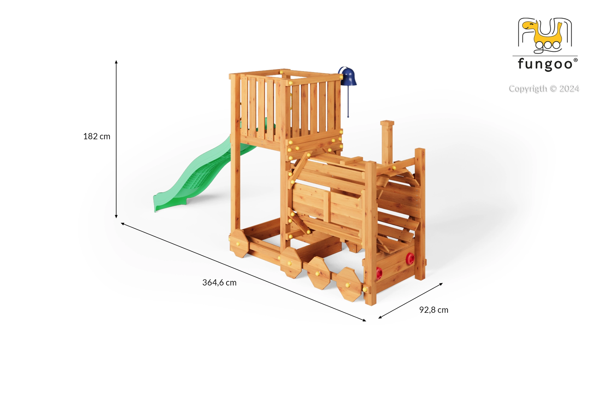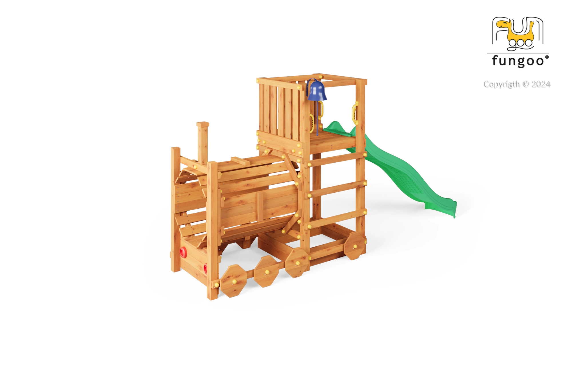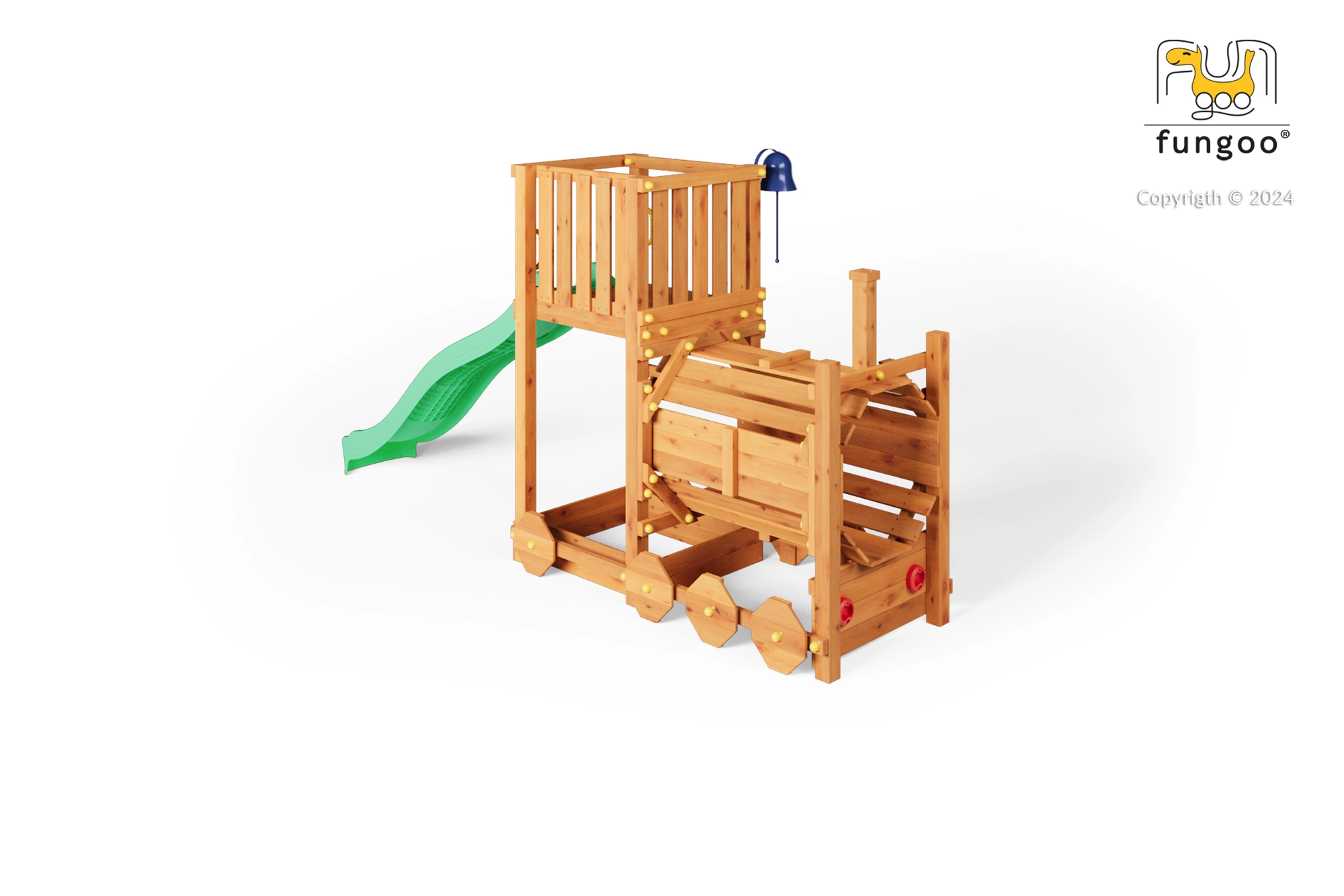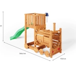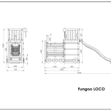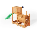 A FUNGOO Loco játszótér mozdony alagúttal kialakítással készült, amely ösztönzi az átbújós játékot, a bújócskát és a mozdonyvezetős szerepjátékot. A hosszú, 2,2 m-es hullámos csúszda rengeteg vidám lecsúszást biztosít, míg a csengő fejleszti a gyerekek képzeletét és az interaktív játékot. A minőségi, impregnált fa szerkezet időjárásálló, és biztonságosan rögzíthető a talajhoz.