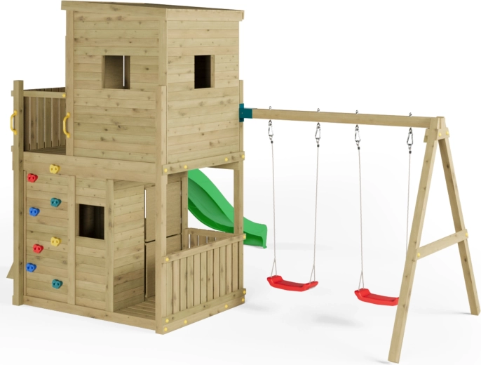 Színes mászófogások fejlesztik az erőt és a koordinációt, a két állítható hinta erős köteleken egyéni és közös szórakozást is lehetővé tesz.