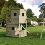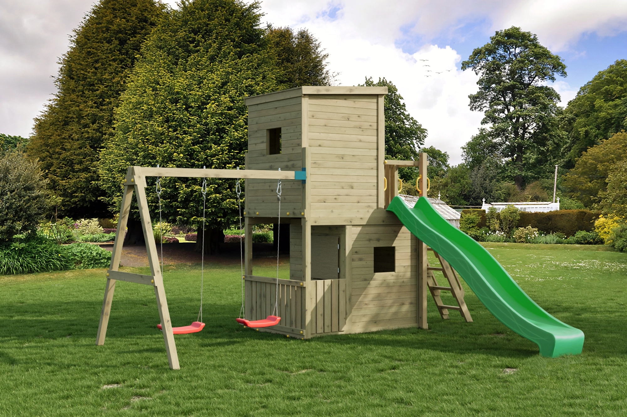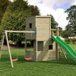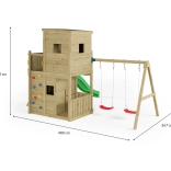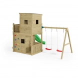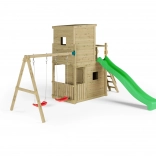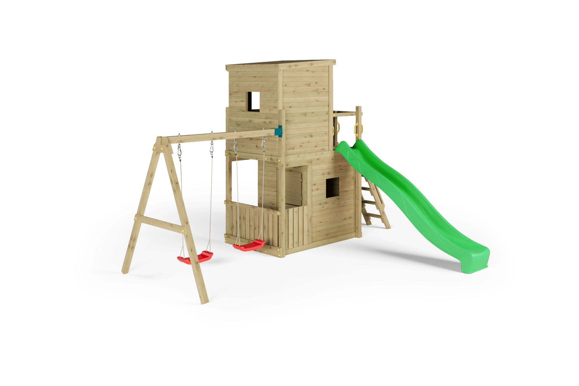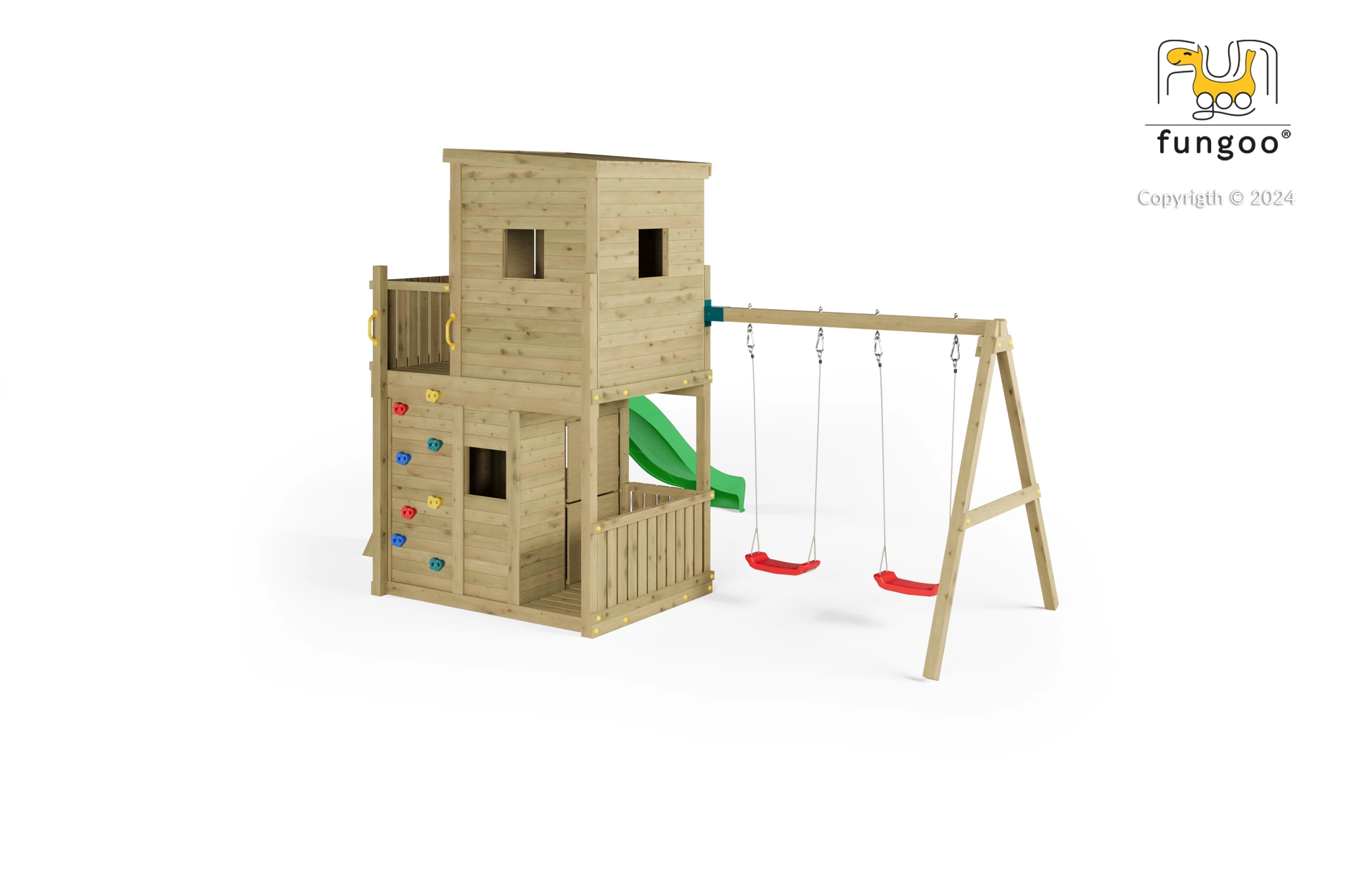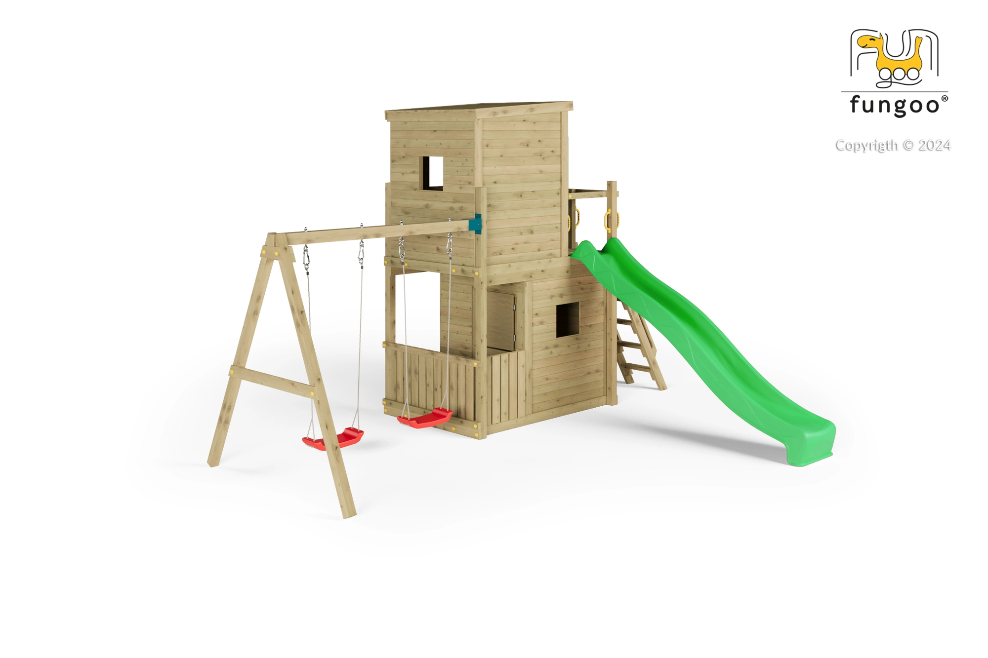 A FUNGOO Lofter játszótér stabil fából készült szerkezetet ötvöz gazdag felszereltséggel a sokoldalú játékért: magas kuckó tetővel és ajtóval, 2,9 m-es hullámos csúszda, mászófal fogásokkal, kényelmes fellépés lépcsőn, valamint keret két hintával. A minőségi kötéseknek, biztonsági kapaszkodóknak és rögzítő elemeknek köszönhetően az egész megoldás szilárdan lehorgonyzott, és készen áll a mindennapos használatra.