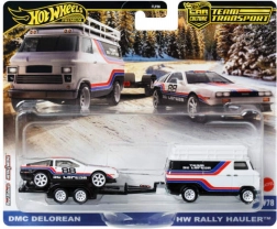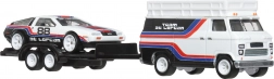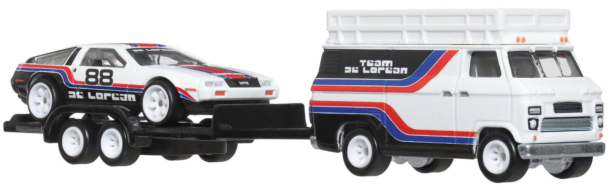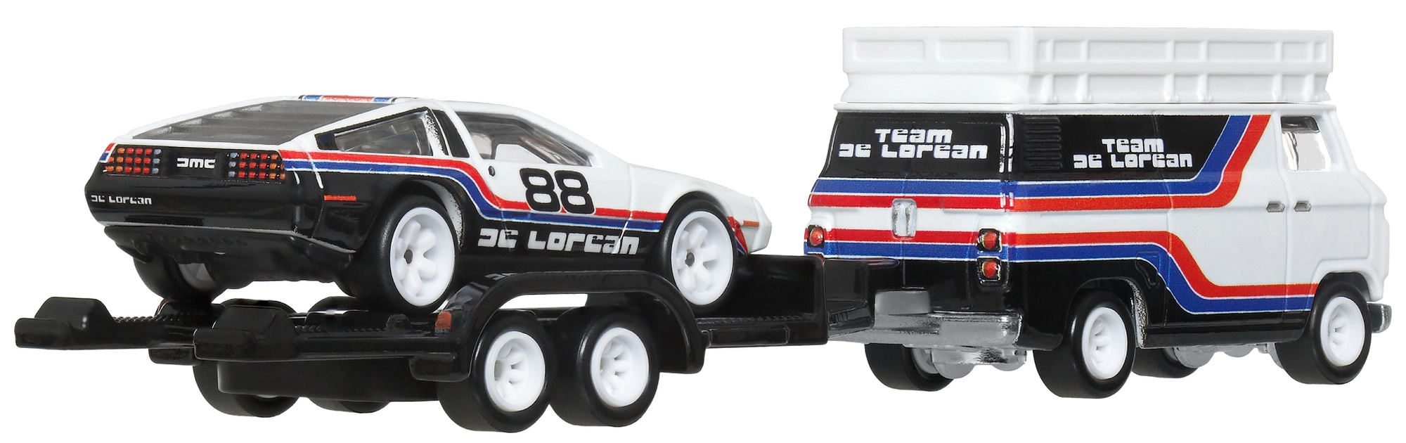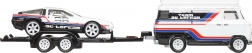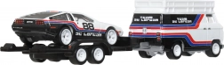 Élvezd a csúcsminőségű kidolgozást és a versenyhangulatot a Team DeLorean szállítószettel. A fehér nyerges vontató és utánfutó a DMC DeLorean #78 sportautót szállítja fekete–fehér színkombinációban piros és kék csíkokkal. A szett azonnal kiállítható és játszható – csak vedd ki a dobozból, és irány a pálya.