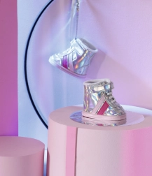 Fűzős cipők holografikus hatással és rózsaszín elemekkel, amelyek divatcikk a babadivat világában.