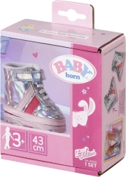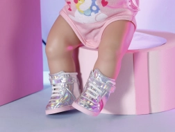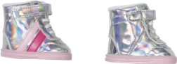 BABY born Holografikus sportcipők ideális kiegészítő minden kis stylist számára. Ezek a stílusos ezüst cipők rózsaszín csíkokkal és tépőzáras megoldással biztosítják a könnyű felhúzást és tökéletesen kiegészítik a babák divatos ruháit.