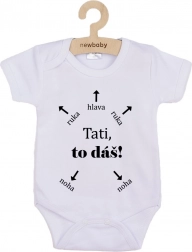Kényelmes, rövid ujjú baba body az NEW BABY márkától, eredeti felirattal: „Apa, menni fog!”. 100% puha, légáteresztő pamutból készült, kíméletes az érzékeny bőrhöz. Praktikus pattentos zárás a vállon és a lábak között, ami megkönnyíti az öltöztetést és a pelenkacserét. Tanúsított festékek és anyag OEKO-TEX STANDARD 100 minősítéssel a biztonságos viselésért, már újszülötteknek is.
