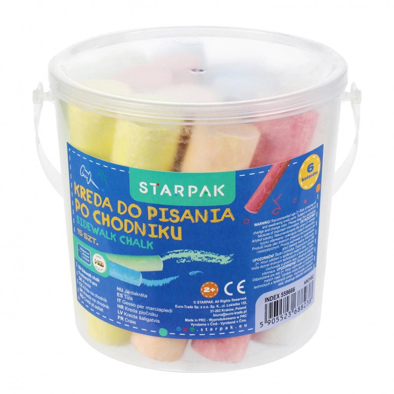 Praktikus, nagy krétakészlet kreatív játékhoz otthon és a szabadban. A csomag 15 darab krétát tartalmaz, méretük 10 × 2 cm, ideális táblára és járdára való rajzoláshoz. 3 éves kortól ajánlott.