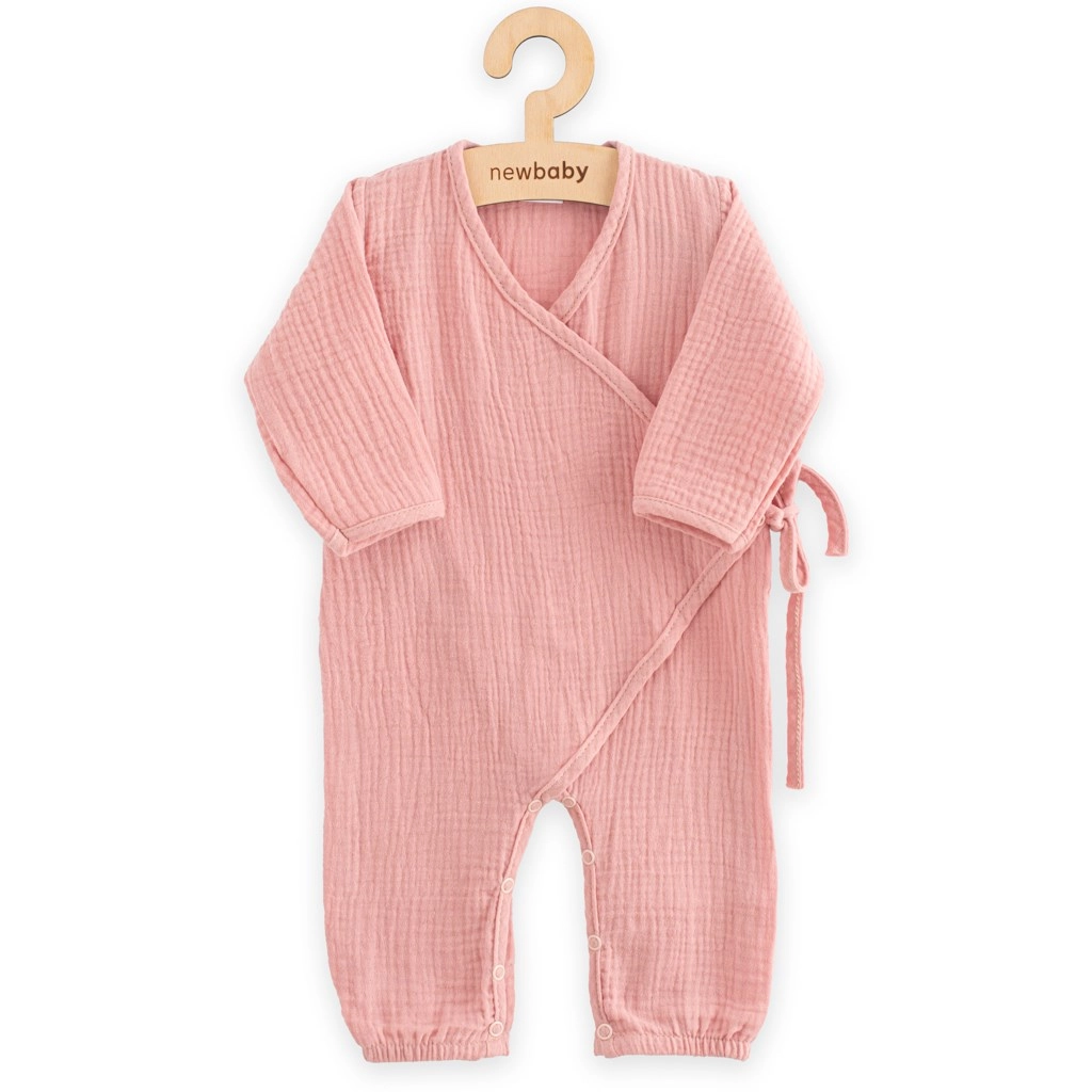 Stílusos muszlin overál New Baby hosszú ujjal a kényelmes mindennapi viselethez. Keresztpántos szabású oldalsó megkötővel, patentokkal a könnyű pelenkázáshoz a lábak között és finom, rugalmas szegélyekkel a szárakon. 100% pamut muszlinból készült, OEKO-TEX STANDARD 100 tanúsítvánnyal – légáteresztő, puha és kíméletes az érzékeny bababőrhöz.