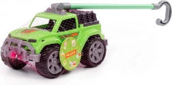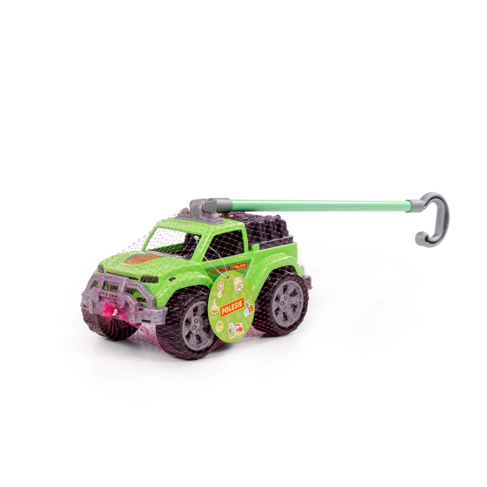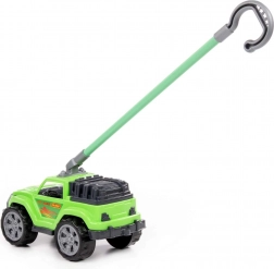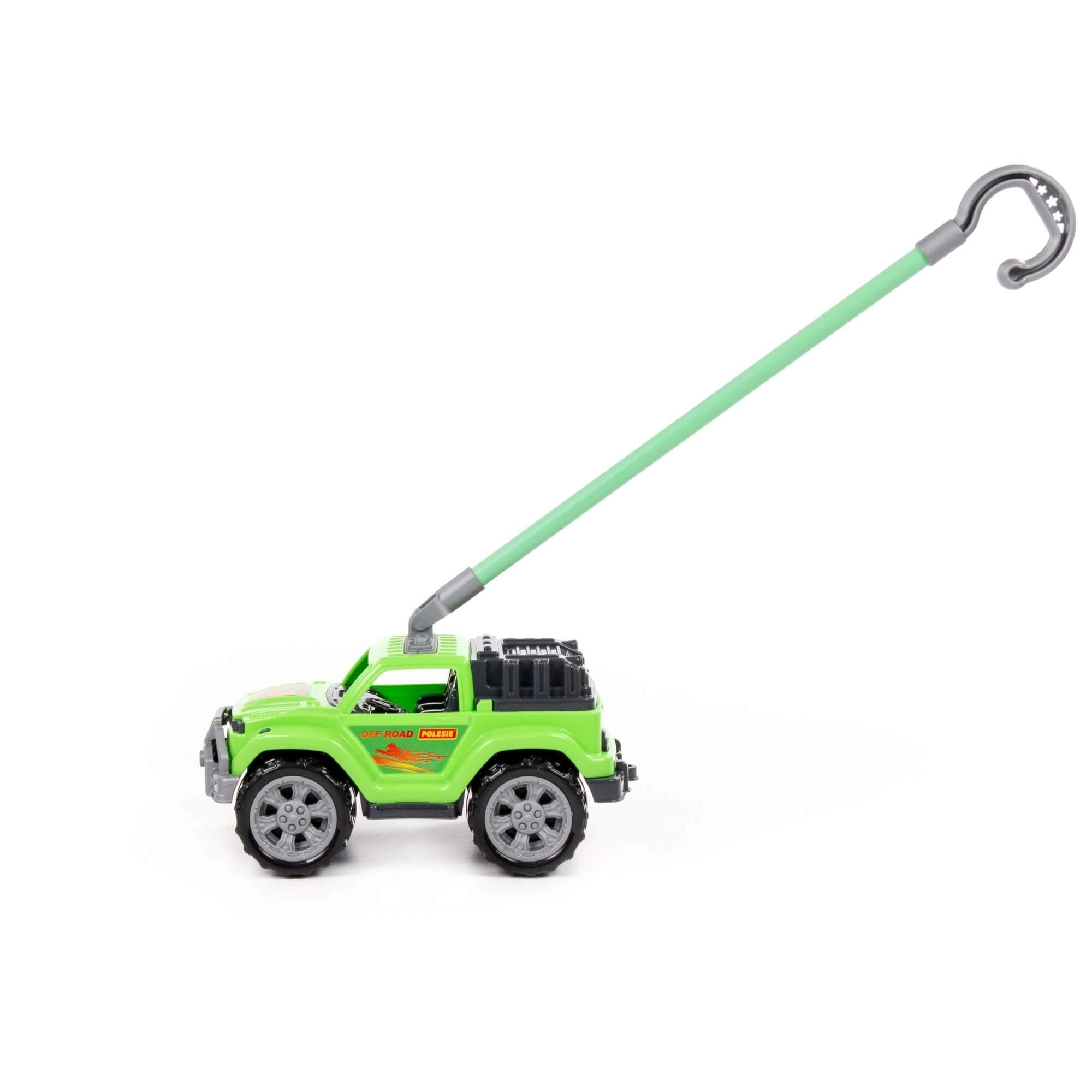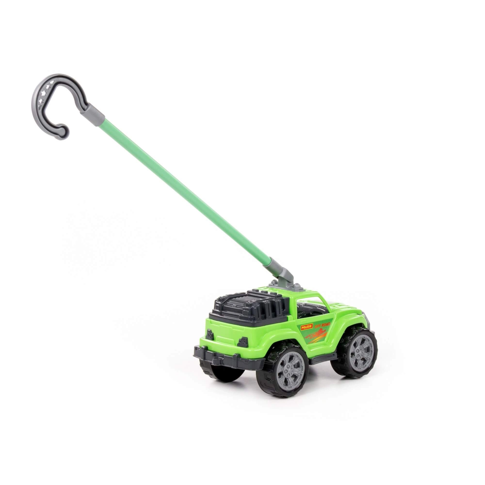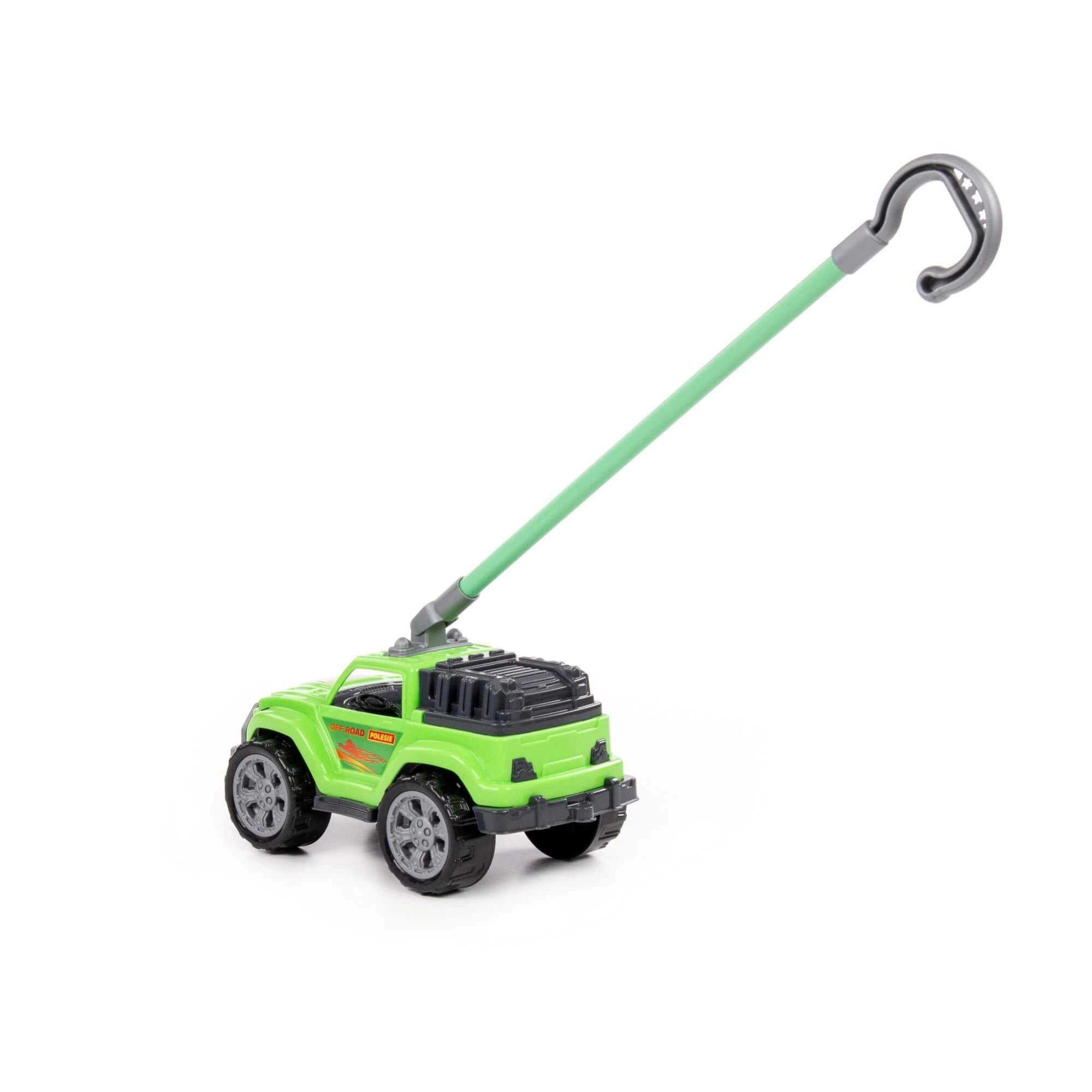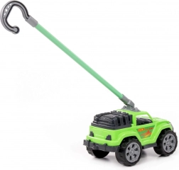 Ez a masszív, zöld tolható kisautó valósághű terepmegjelenésével, nagy kerekeivel és a kampós fogású, levehető fogantyúval örömet szerez a kis sofőröknek. Stabil szerkezetének és a kerekek sima futásának köszönhetően könnyen irányítható járdán, füvön és a lakás padlóján is.