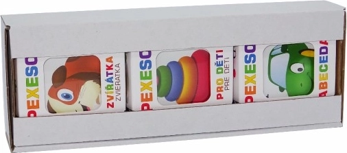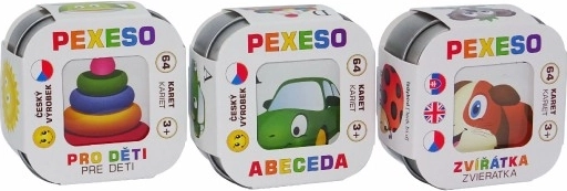 Pexeso az egyik legkedveltebb gyerekjáték, amely segíti a gyerekek fejlődését. Ez a készlet három különböző pexesót tartalmaz fémdobozokban, amelyek az ábécére, állatkák angol nyelven és gyerekjátékokra összpontosítanak.