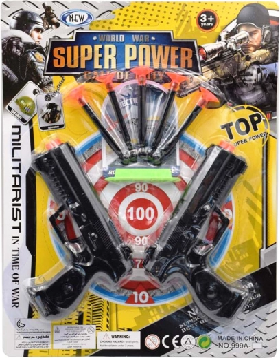 A csomag mindent tartalmaz az azonnali játékhoz – két pisztoly párbajhoz vagy csapatjátékhoz, öt tapadókorongos lőszer és céltábla. Csak rögzítsd a célt, töltsd be a lőszert, és találd el a közepét! Az ár a teljes csomagra vonatkozik.