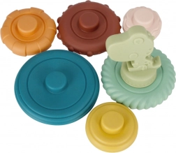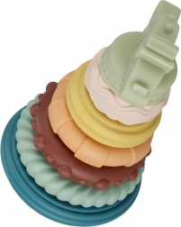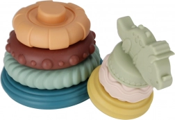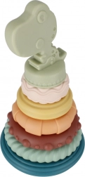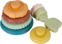 A BAB BAM összeállítható piramis dinoszaurusszal ideális szenzoros játék csecsemőknek és totyogóknak. A különböző felületű színes gyűrűk (barázdák, bütykök, hullámok) ösztönzik a felfedezést, rágcsálást és a középső tüske köré rakosgatást. A gyermek természetes módon gyakorolja a fogást, a méret szerinti válogatást és a koordinációt.