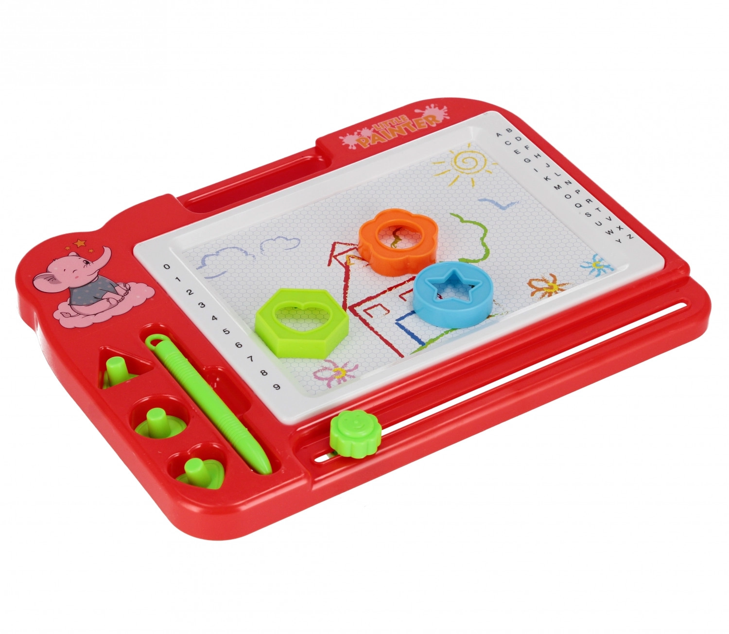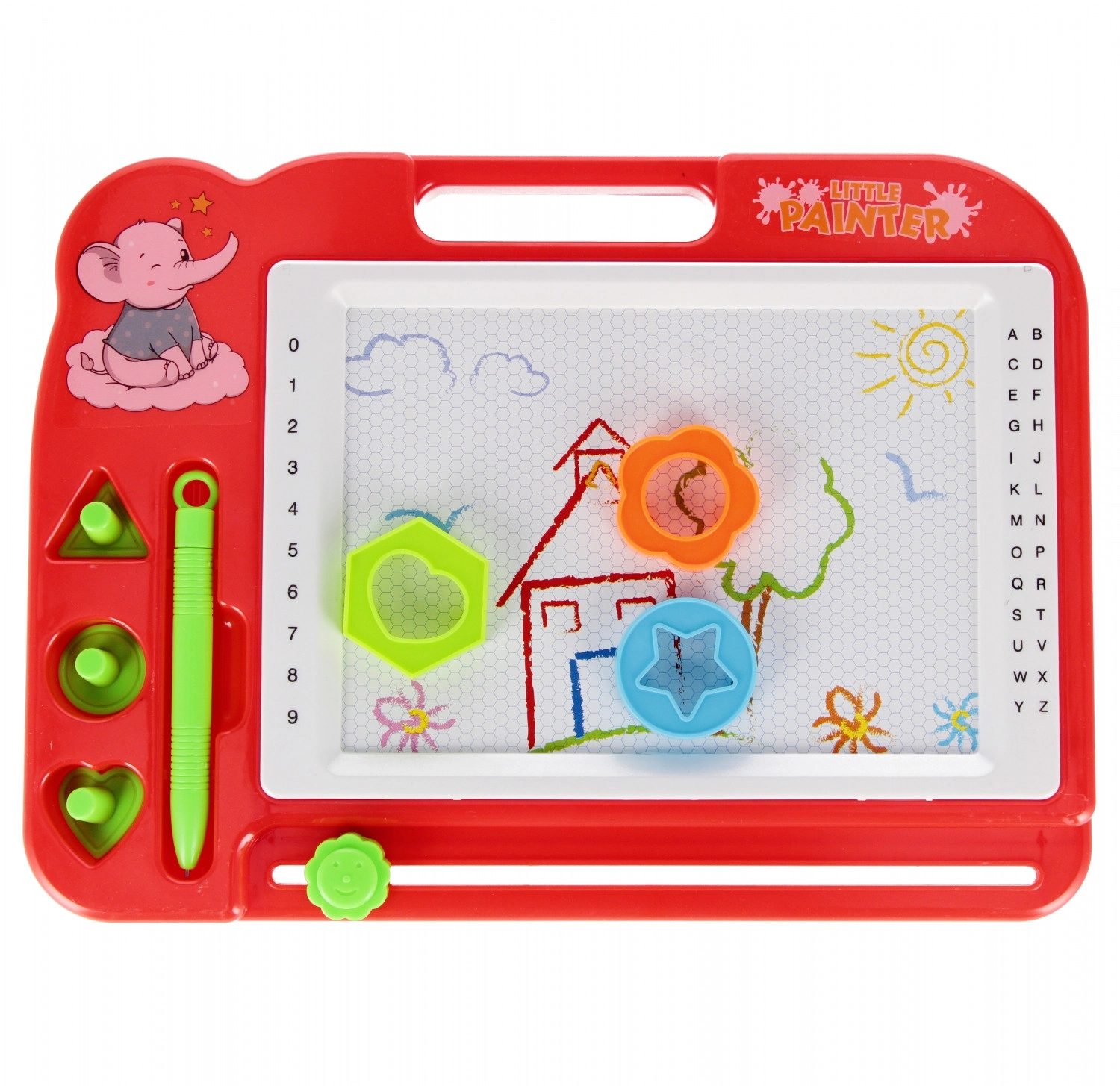 A tábla szélén lévő ábécé és számok természetes, játékos módon ösztönzik az első írásra és számolásra.