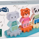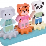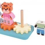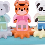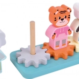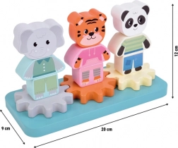 Három aranyos figura – elefánt, tigris és panda – színes, egymásra rakható elemekből áll, amelyeket a gyerekek válogathatnak, kombinálhatnak és egymásra építhetnek. Az okos fogaskerék-rendszer összeköti az összes figurát: ha az egyiket elforgatják, mind megindul, így a gyerekek azonnal látják az ok–okozatot.