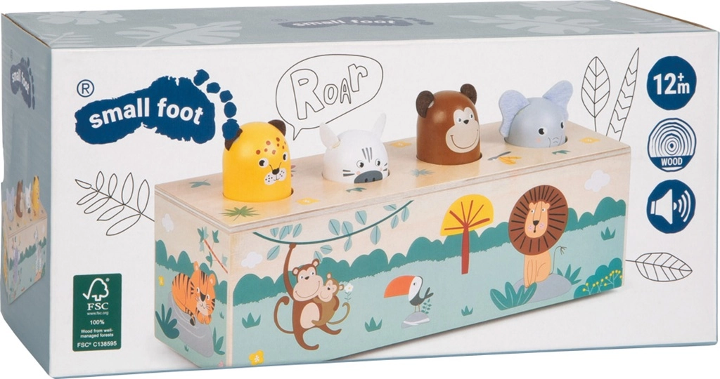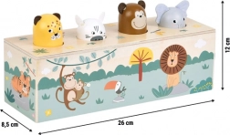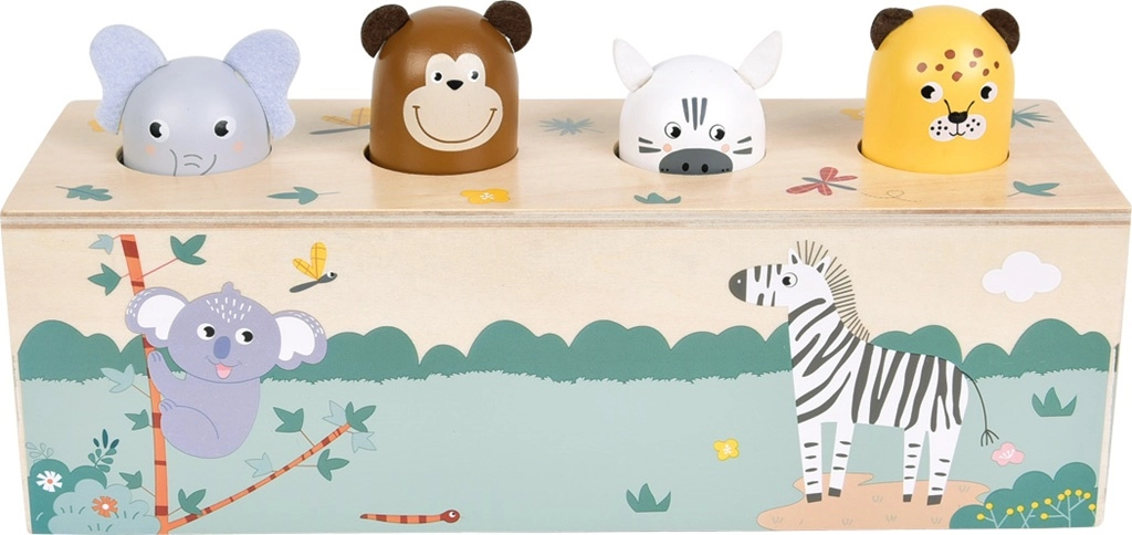 Ez a strapabíró fa zenélő doboz négy állatfigurával nagyszerű társ az első felfedezésekhez. A gyerekek a gomb megnyomása után vidám fejmozgást látnak és valósághű hangokat hallanak, így játékos formában gyakorolják az ujjak motorikáját és erősítik a logikus gondolkodást.