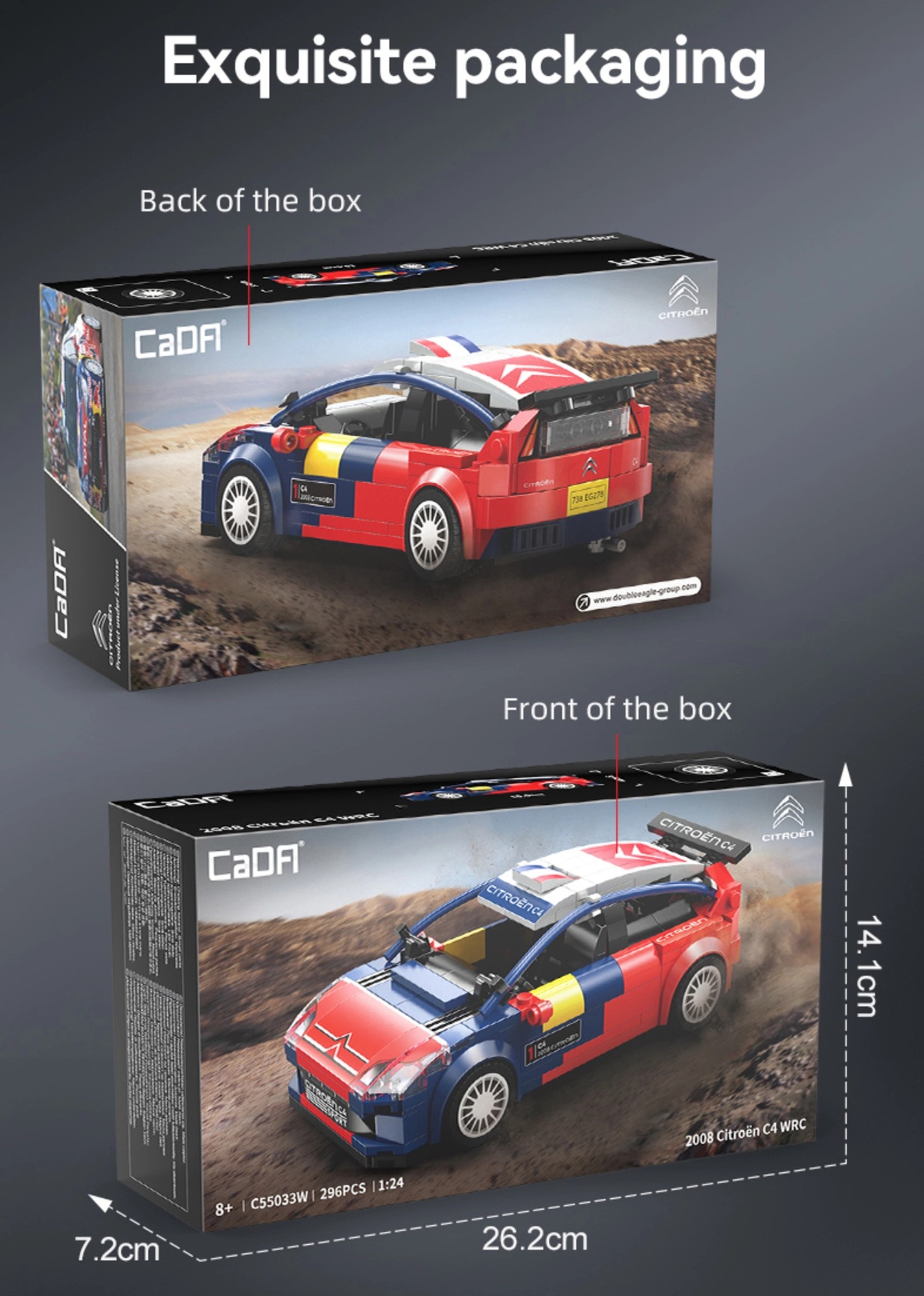 Élvezd a precíz építést és a lenyűgöző megjelenést a licencelt CITROËN C4 WRC modellen. A CaDA építőkészlet kiegyensúlyozottan ötvözi a könnyű építést és a kiváló kidolgozást, amelynek eredménye egy statikus modell sima gördüléssel, kiállításra és játékos gurításhoz sík felületen egyaránt kész.