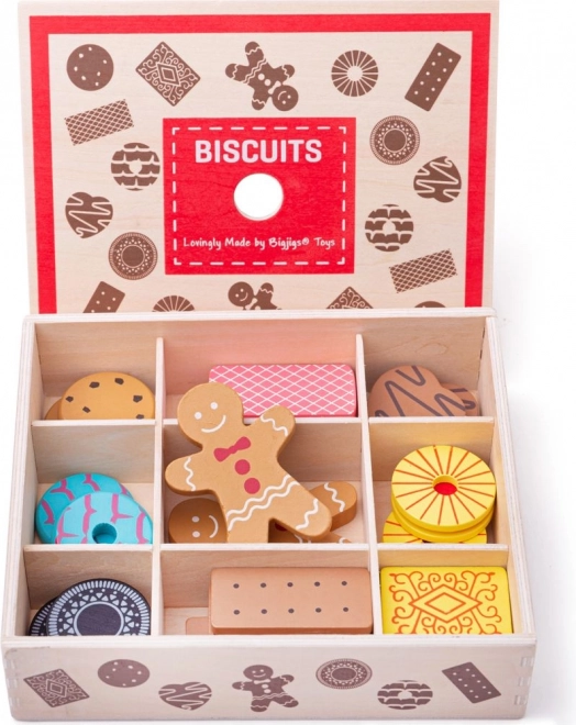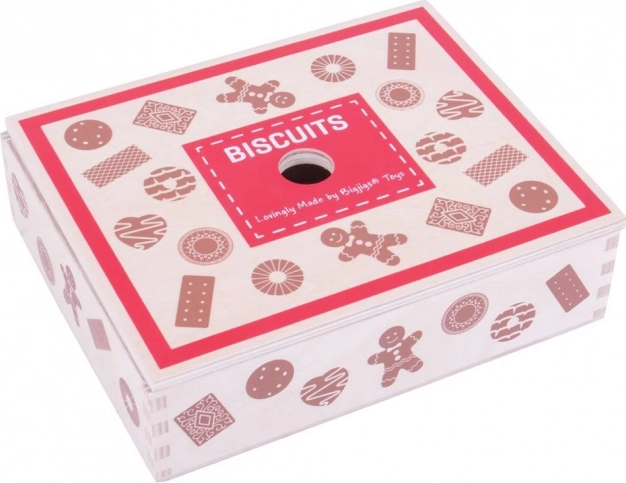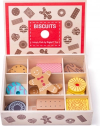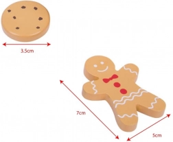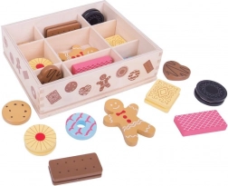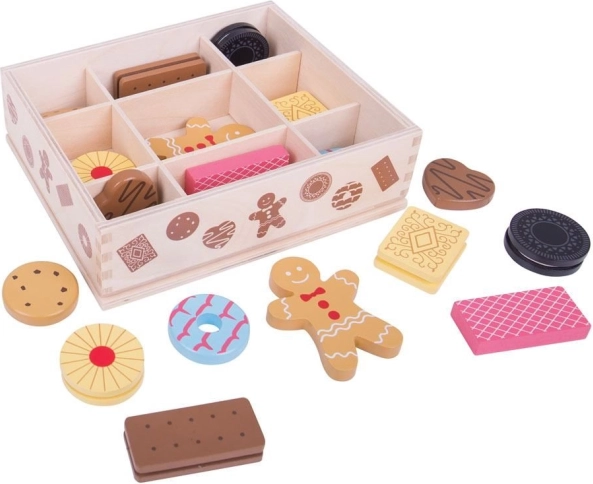 Bemutatjuk a fa dobozt játék sütikkel, amely kedvelt sütik válogatását tartalmazza, beleértve mézeskalácsokat és más finomságokat. Ez a készlet lehetőséget ad a kisgyermekeknek, hogy kreativitásukat fejlesszék a sütés által inspirált játék révén.