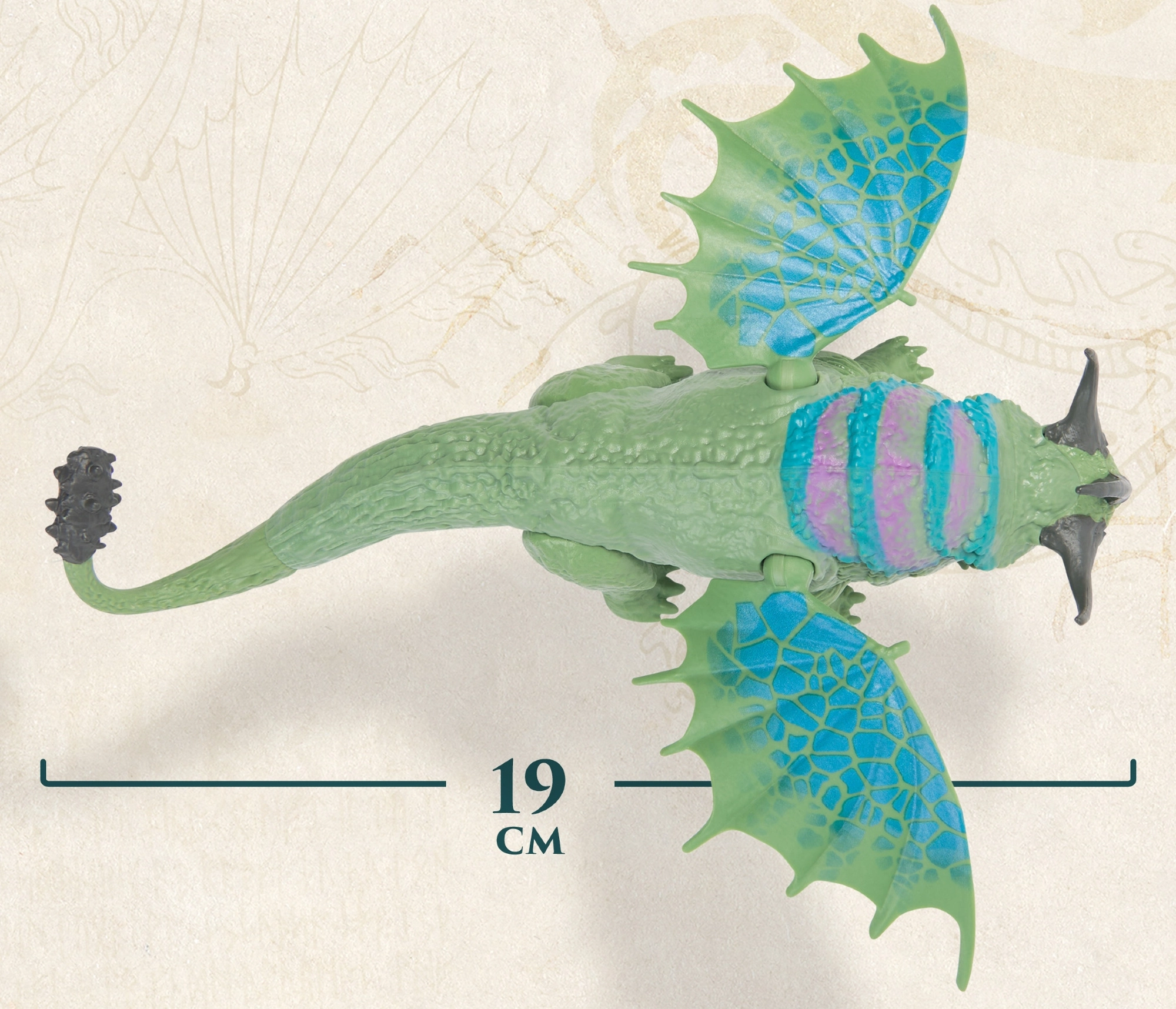 A Rumblehorn figura robusztus testalkatával, kifejező szarvaival és nagyméretű, egyedi mintázatú szárnyaival nyűgöz le. A DREAMWORKS Dragons filmes világa ihlette, és hűen adja vissza a népszerű sárkány megjelenését. A mozgatható ízületek dinamikus pózokat tesznek lehetővé – a Berk fölötti felszállástól a harci testtartásokig.