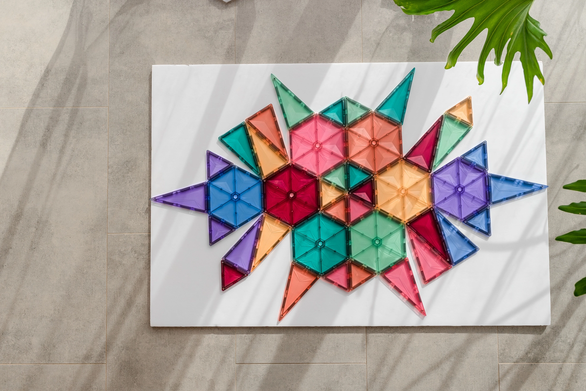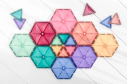 Háromszögeket és hatszögeket tartalmaz 2D motívumok és 3D objektumok építéséhez. Ideális a szimmetria, a térbeli viszonyok és a mintázatok fejlesztésére.