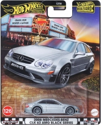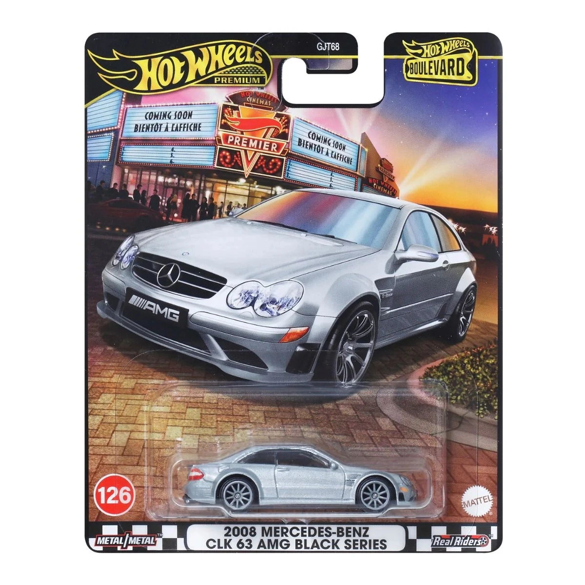 Gyűjtői modell Mercedes‑Benz CLK 63 AMG Black Series a HOT WHEELS Premium Boulevard sorozatából, 1:64 méretarányban, élethű részletekkel, fém karosszériával és Real Riders gumigumikkal. Ideális gyűjtőknek és 3 éves kortól gyermekeknek is, szabadon forgó kerekekkel és kb. 7 cm hosszúsággal.