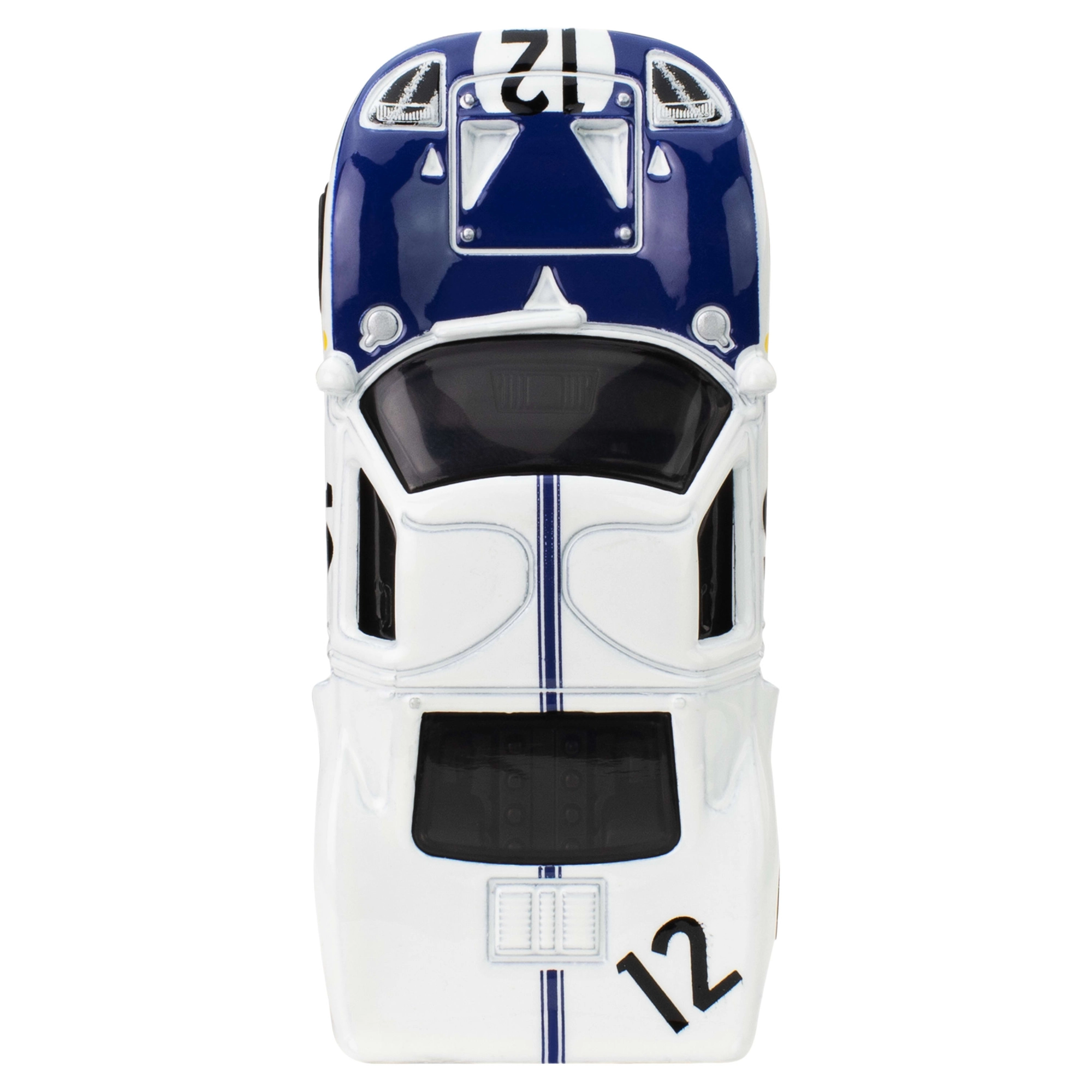 A fehér karosszéria kék csíkokkal, 12-es rajtszámmal és élethű részletekkel kiemeli a FORD GT40 ikonikus megjelenését.