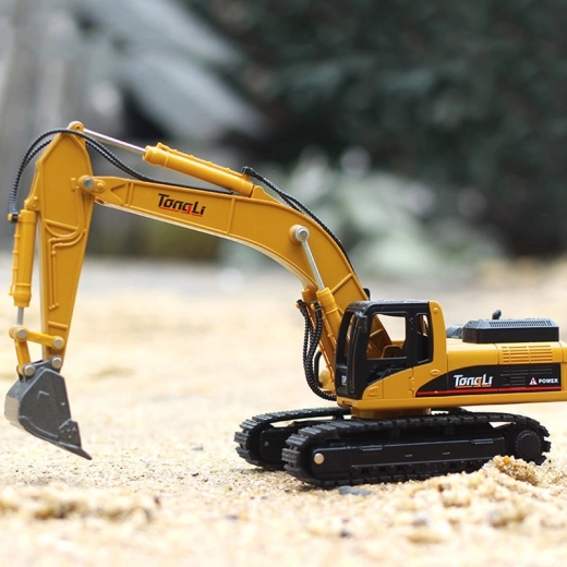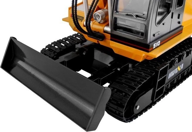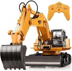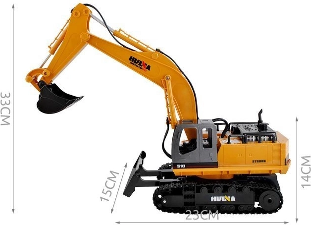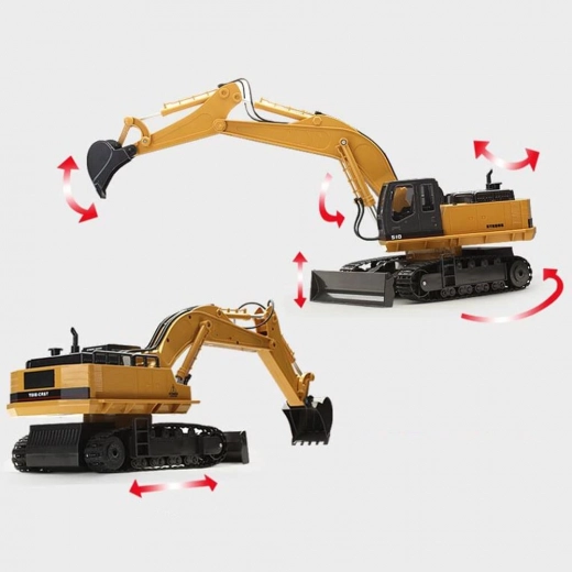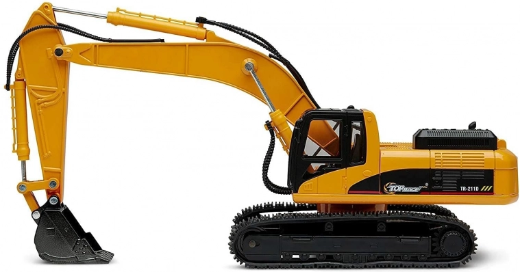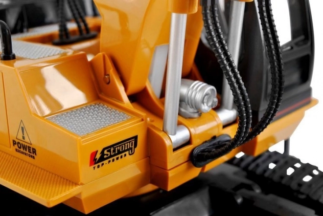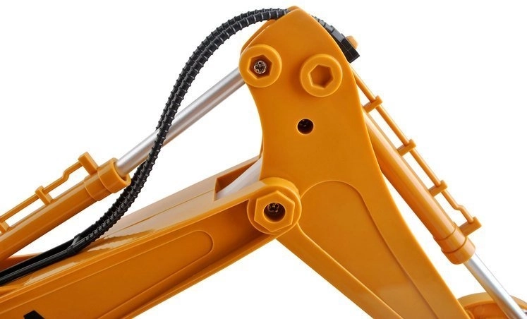 A távirányítós kotrógép masszív építőjárművekre jellemző konstrukcióval rendelkezik, valamint klasszikus színvilágot kínál - a sárga karosszéria számos fekete színű kontrasztos részlettel kombinálva van.