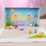 Három átlátszó talapzat biztosítja a kedvenc figurák stabil kiállítását, a tematikus háttér pedig megteremti a kisvárosi hangulatot híddal és úttal.
