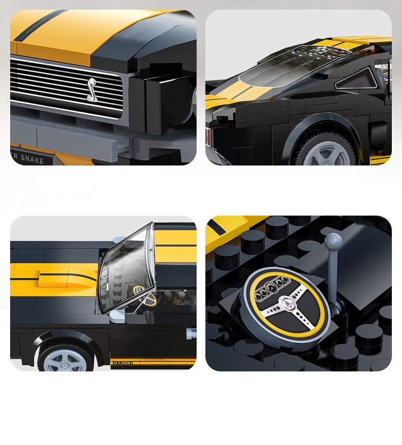 Ez a minőségi CaDA építőkészlet hűen kidolgozott SHELBY GT350H modellt kínál elegáns fekete–arany kombinációban. Összeépítés után a jármű mérete kb. 21,2 × 9,3 × 6,5 cm, sebessége legfeljebb 3,8 km/h, és a nyitható motorháztetőnek köszönhetően rálátást ad a részletes V8-as motorra. A nyomtatott dekorok hosszú élettartamot és prémium megjelenést biztosítanak matricázás nélkül.