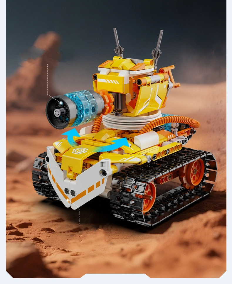 Masszív lánctalpai sima haladást biztosítanak különböző felületeken. A mozgatható karok, a forgatható fej és a világító elemek növelik a realizmust és a szórakozást.