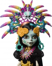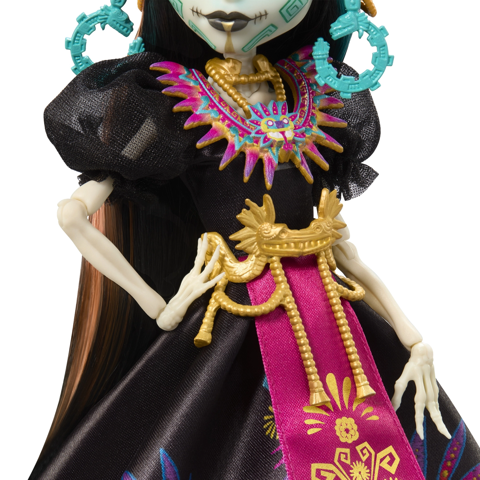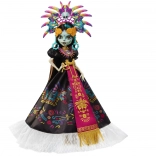 A Monster High Skullector kollekciós kiadás tiszteleg a mexikói Día de Muertos ünnep előtt. Skelita Calaveras elbűvölő, hosszú fekete, szaténfényű ruhát visel színes mintákkal és feltűnő magenta vállszalaggal arany rojtokkal. A domináns tollas fejdísz, a karakteres ékszerek és a részletes arcfestés különleges darabbá teszik a dizájn és kultúra rajongói számára.