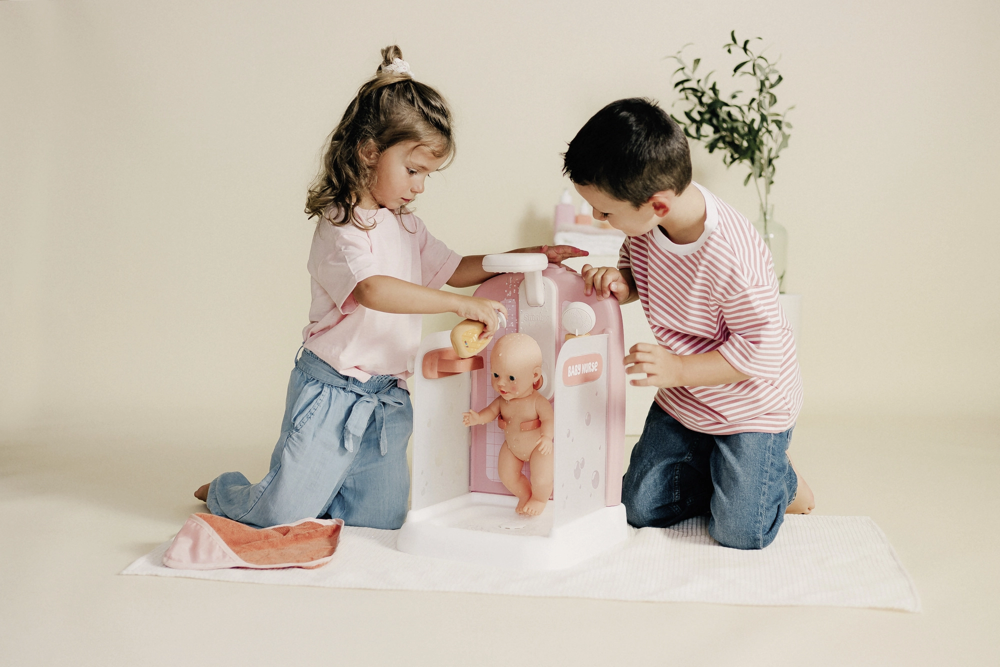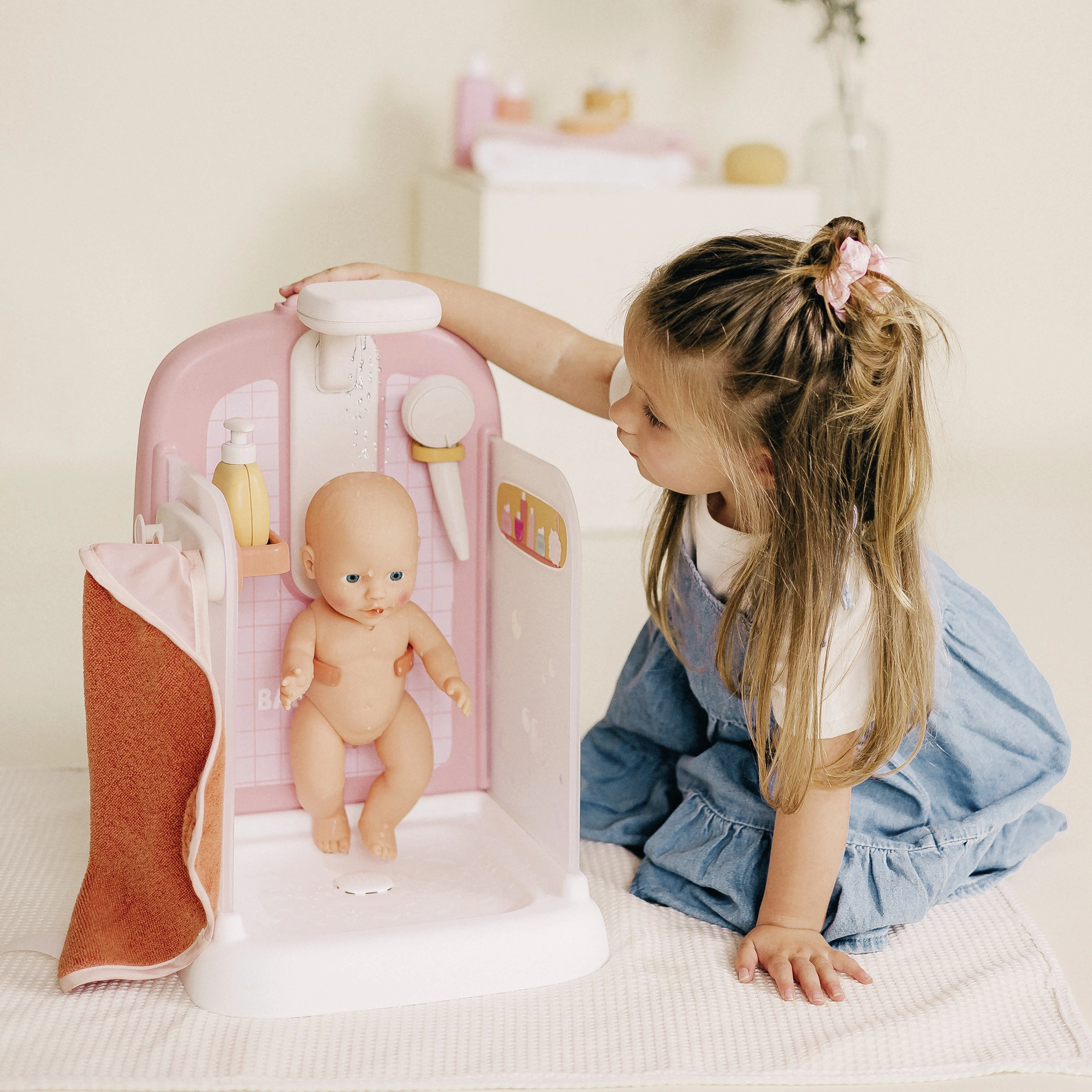 Fedezd fel a valósághű babagondozást a BABY NURSE elegáns rózsaszín-fehér zuhanykabinjával. A gomb megnyomása után a zuhanyból víz folyik, így a gyerekek a babát valóban „megfürdethetik”, majd beburkolhatják a puha kapucnis törölközőbe. A praktikus tartó segítségével a baba a zuhany alatt önállóan állhat, így a gyerekeknek szabad a keze a mosdatáshoz és az öblítéshez.