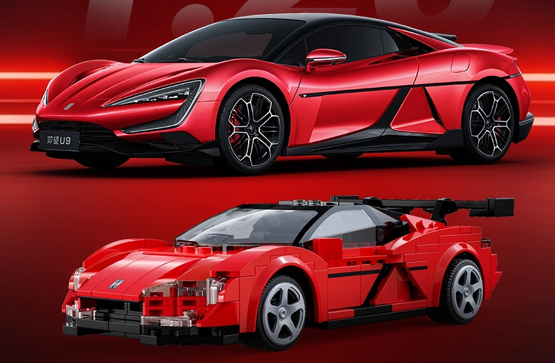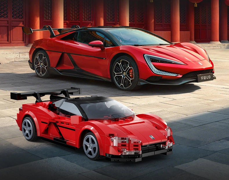 A piros karosszéria nyomtatott mintákkal, az átlátszó fényszórók és a nagy hátsó szárny hűen idézik a YANGWANG U9 sportautó megjelenését.