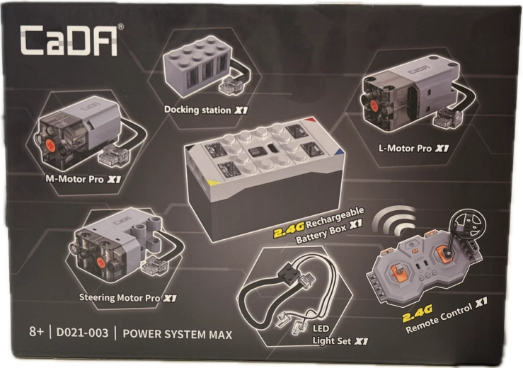 Bővítse CADA készleteit valósághű hajtással és világítással a Power System Max készletnek köszönhetően. Pontos, zavarásmentes 2,4 GHz-es vezérlést, hosszú üzemidőt biztosító akkumulátort és számos szabványos méretű modellhez való kompatibilitást kap. A csomagban három nagy teljesítményű motor, LED világítás, távirányító és USB töltőkábel található – minden, ami a szórakozás új szintre emeléséhez kell.