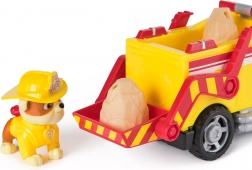 A sárga dömper építkezési elemekkel és sisakos Rubble figurával hiteles élményeket nyújt a PAW Patrol sorozatból.