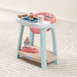 Stabil, magas etetőszék tálcával, amely lehetővé teszi a gyerekeknek, hogy kényelmesen „etetni” tudják a babát, és utánozzák a valódi étkezési rituálékat.
