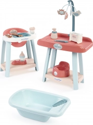 A szett tartalmaz pelenkázó felületet tárolórekeszekkel, kompakt világoskék kádat bili-vel, valamint stabil, magas etetőszéket levehető tálcával. A tartozékok között megtalálható többek között cumisüveg, tálkák és evőeszközök, fésű és „pelenkák”. Minden kb. 32 cm magas babákhoz illeszkedik.