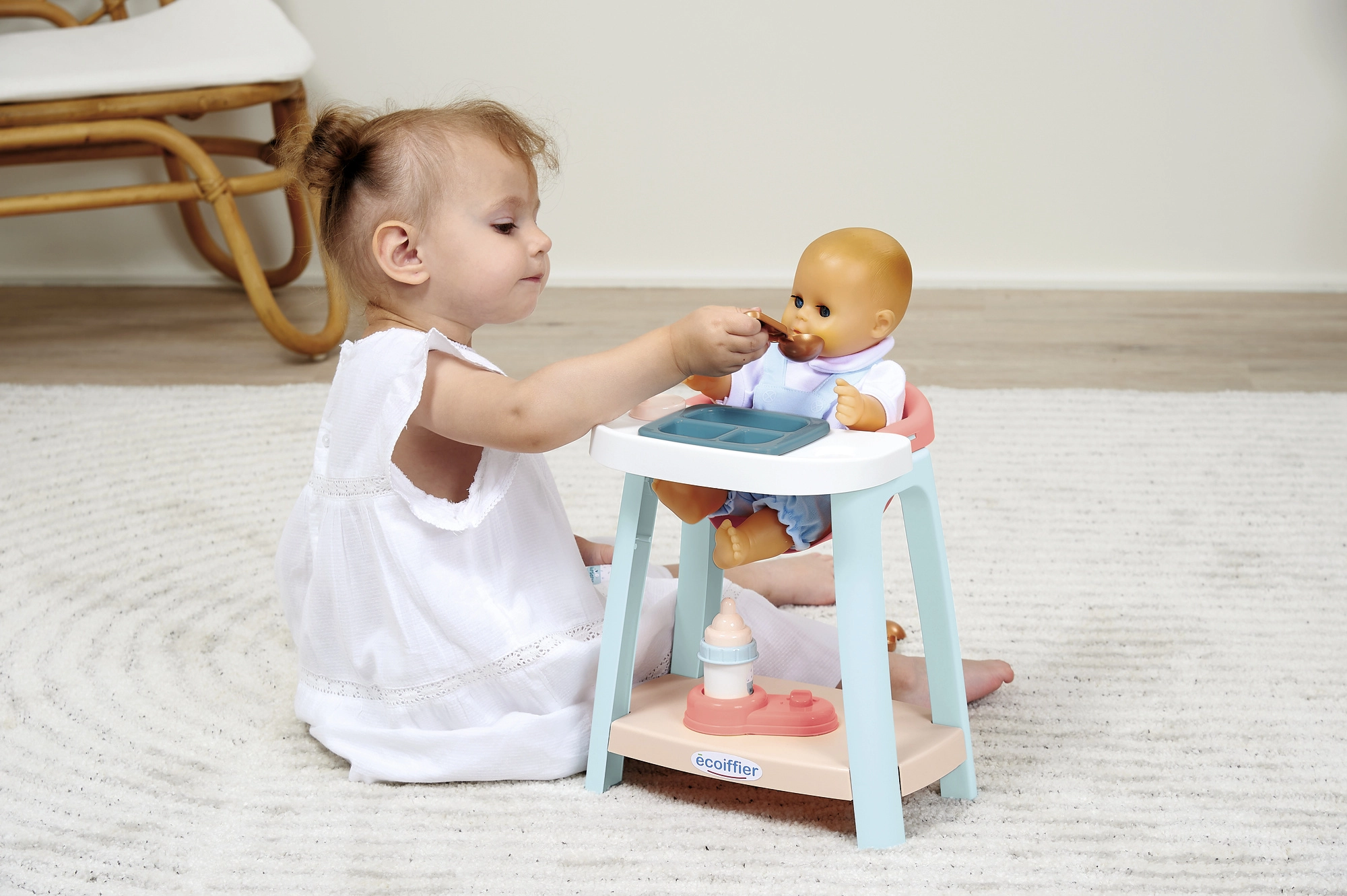 Stabil, magas etetőszék osztott tányérral, bögrével és evőeszközökkel, amely lehetővé teszi a gyerekeknek, hogy valósághűen „etessék” a babát. A lekerekített élek és a masszív szerkezet támogatják a biztonságos játékot.