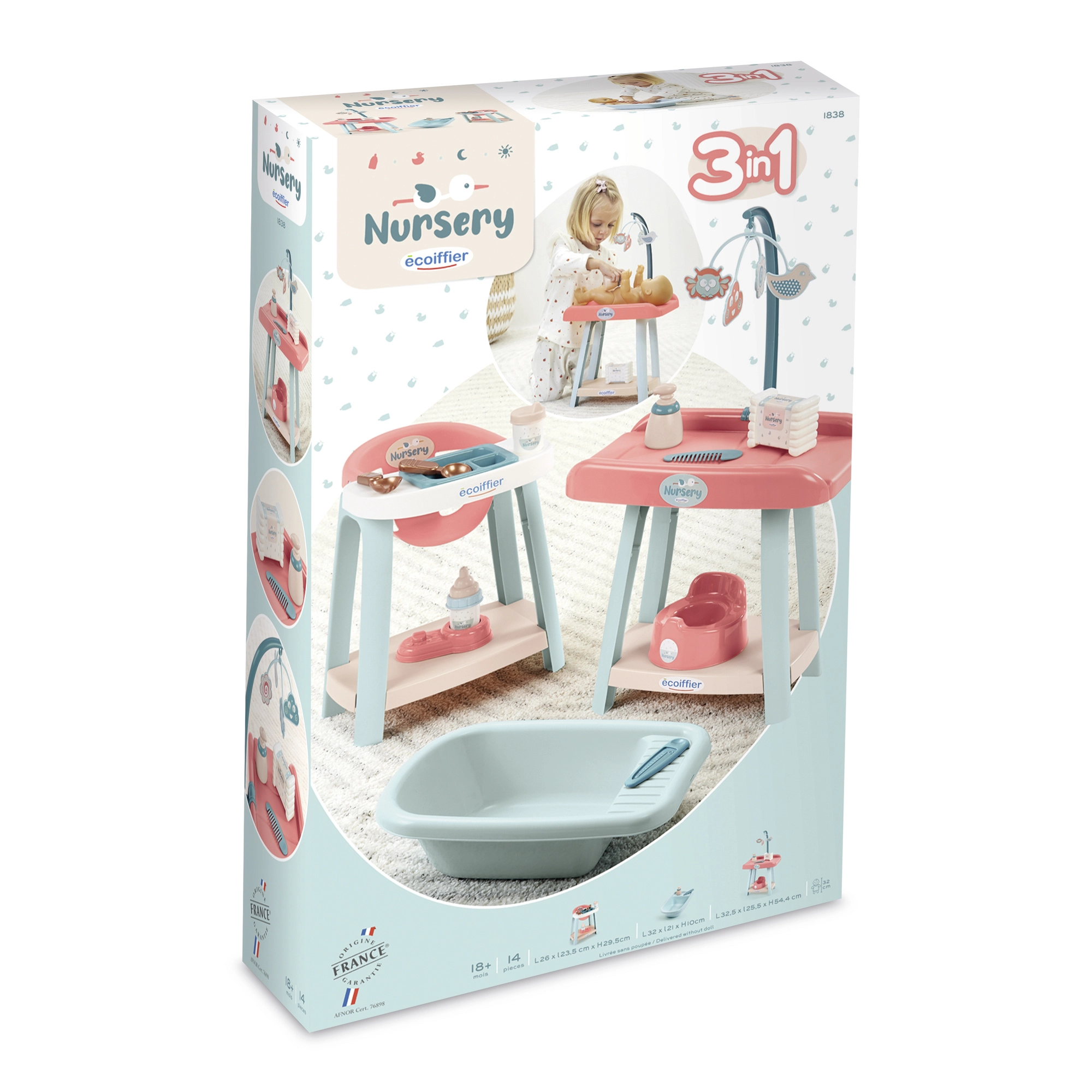Az Ecoiffier Nursery 3 az 1-ben sokoldalú készlet babagondozáshoz, amely mindent kínál az etetéstől a pelenkázáson át a fürdetésig. A három játéktérnek és a gazdag tartozéknak köszönhetően a gyerekek leutánozhatják a mindennapi babaápolást és saját történeteket alkothatnak. A pasztell színek és a lekerekített formák kellemes megjelenést és biztonságos használatot biztosítanak.