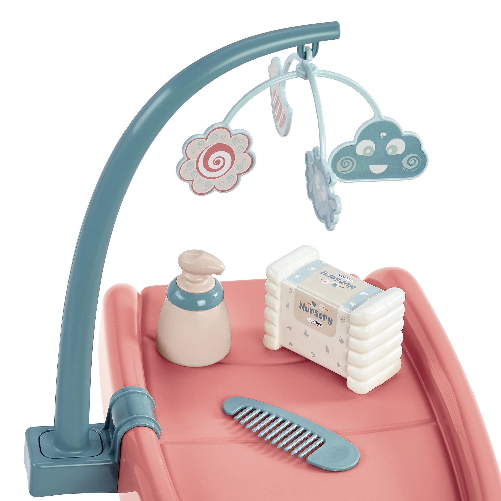 Praktikus pult rekeszekkel a kiegészítőknek és apró kozmetikumoknak, hogy minden kéznél legyen. A pelenkázós és gondoskodó játék erősíti az empátiát és az önállóságot.
