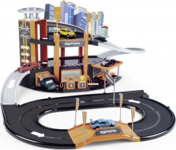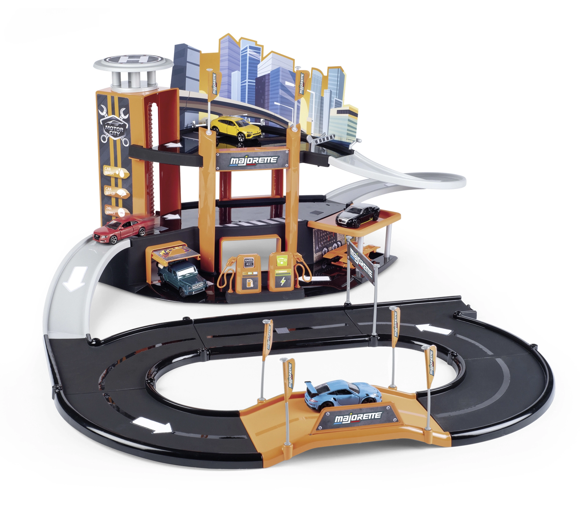A nagy Motor City Plus garázsszett ideális választás a kis autórajongóknak és a gyors vezetés kedvelőinek. A háromszintes parkoló lejáróval és látványos hurkokkal kapcsolódik össze, ami rengeteg akciót garantál. A lift segítségével kényelmesen elérhető bármelyik szint, alul pedig csatlakoztatható az utca a körpályához, így bővíthető a játékvilág.