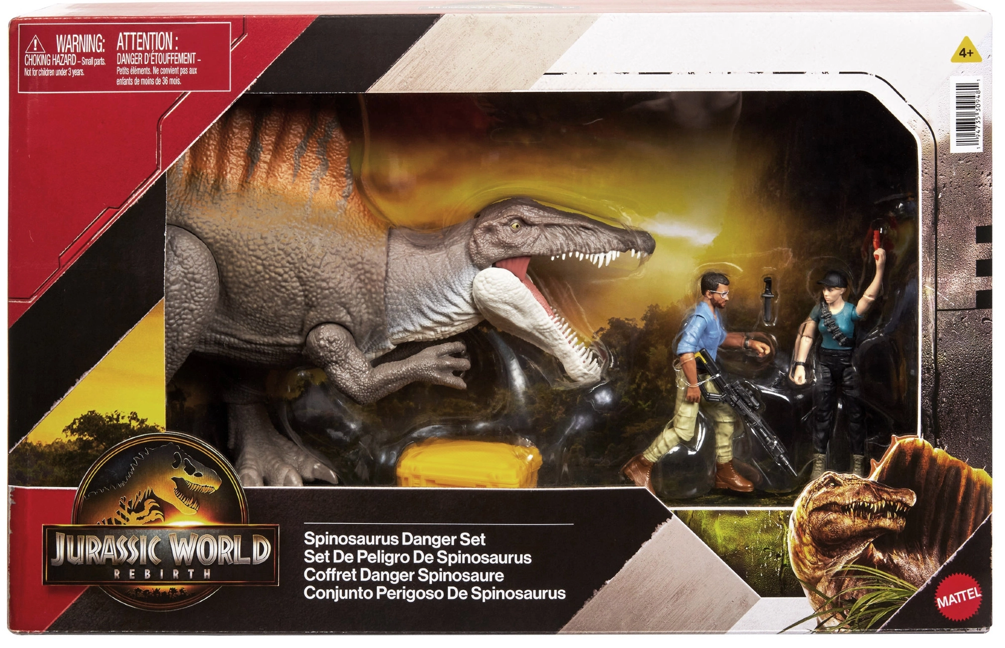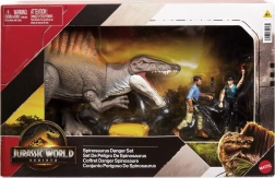 Ez a Mattel készlet egy valósághűen kidolgozott Spinosaurust kínál feltűnő hátvitorlával, nyitható szájjal és mozgó ízületekkel. A két emberi figura kiegészítőkkel – fegyverrel, eszközökkel és egy sárga szállítóládával – bővíti a játéklehetőségeket, lehetővé téve üldözési jelenetek és mentőakciók megalkotását.