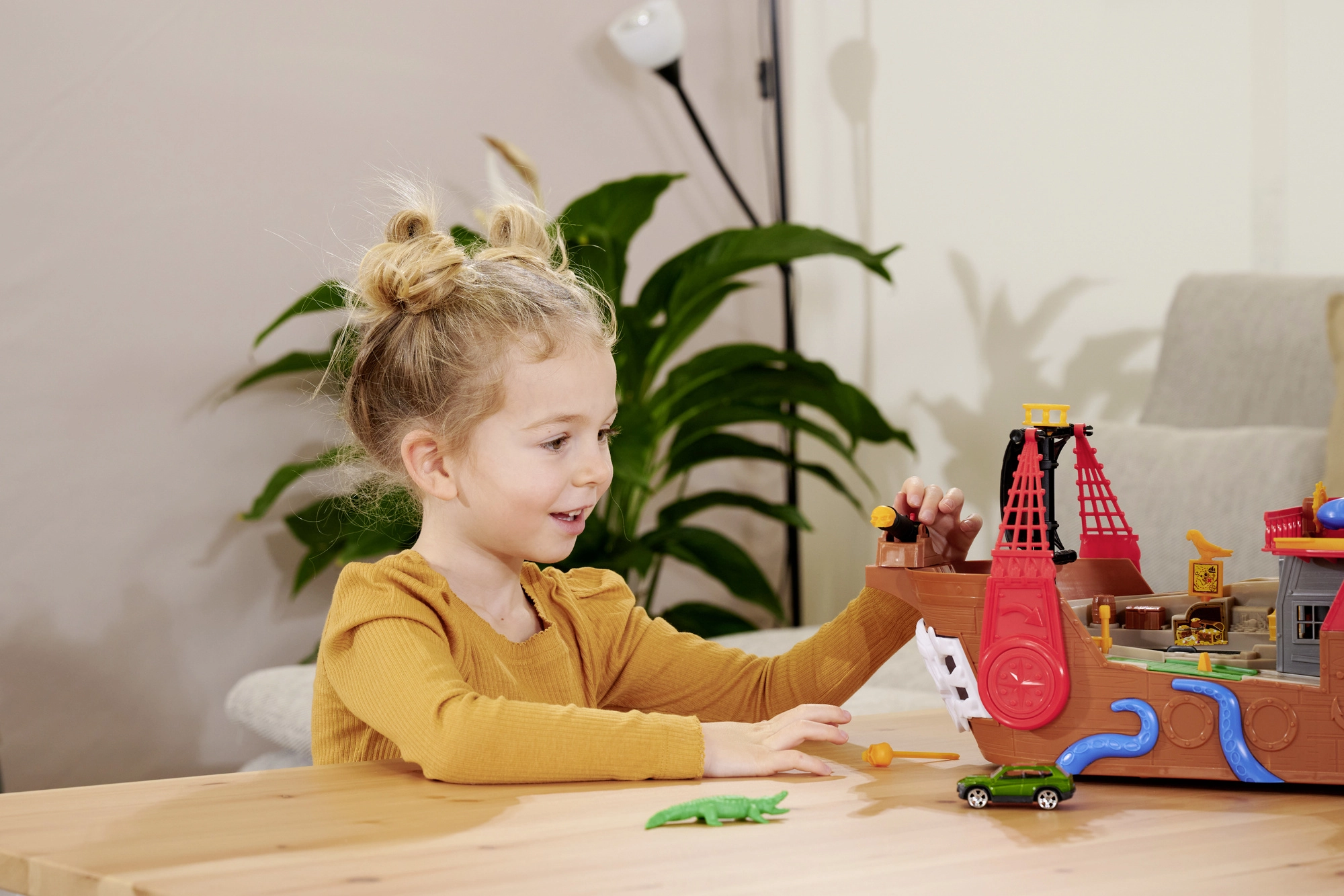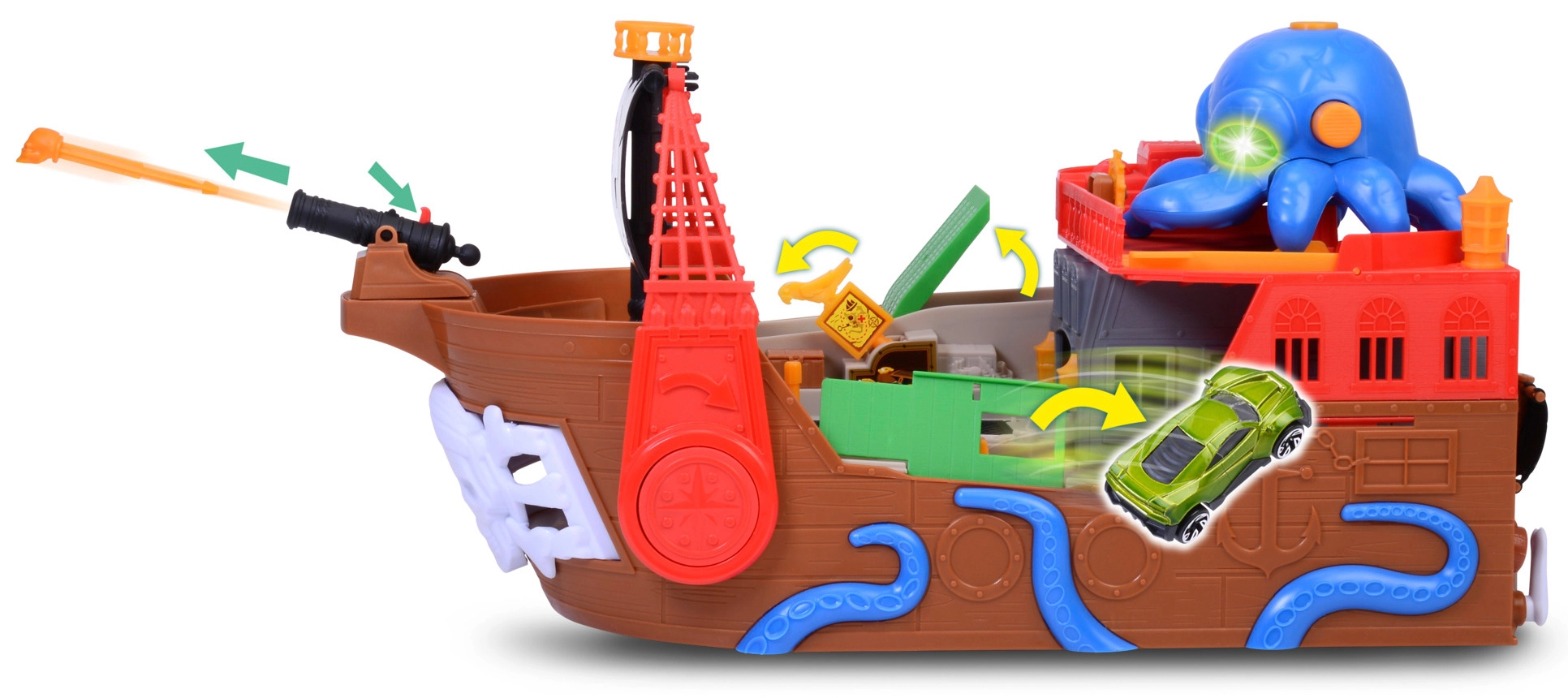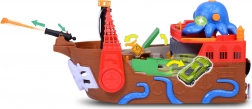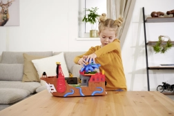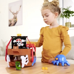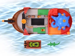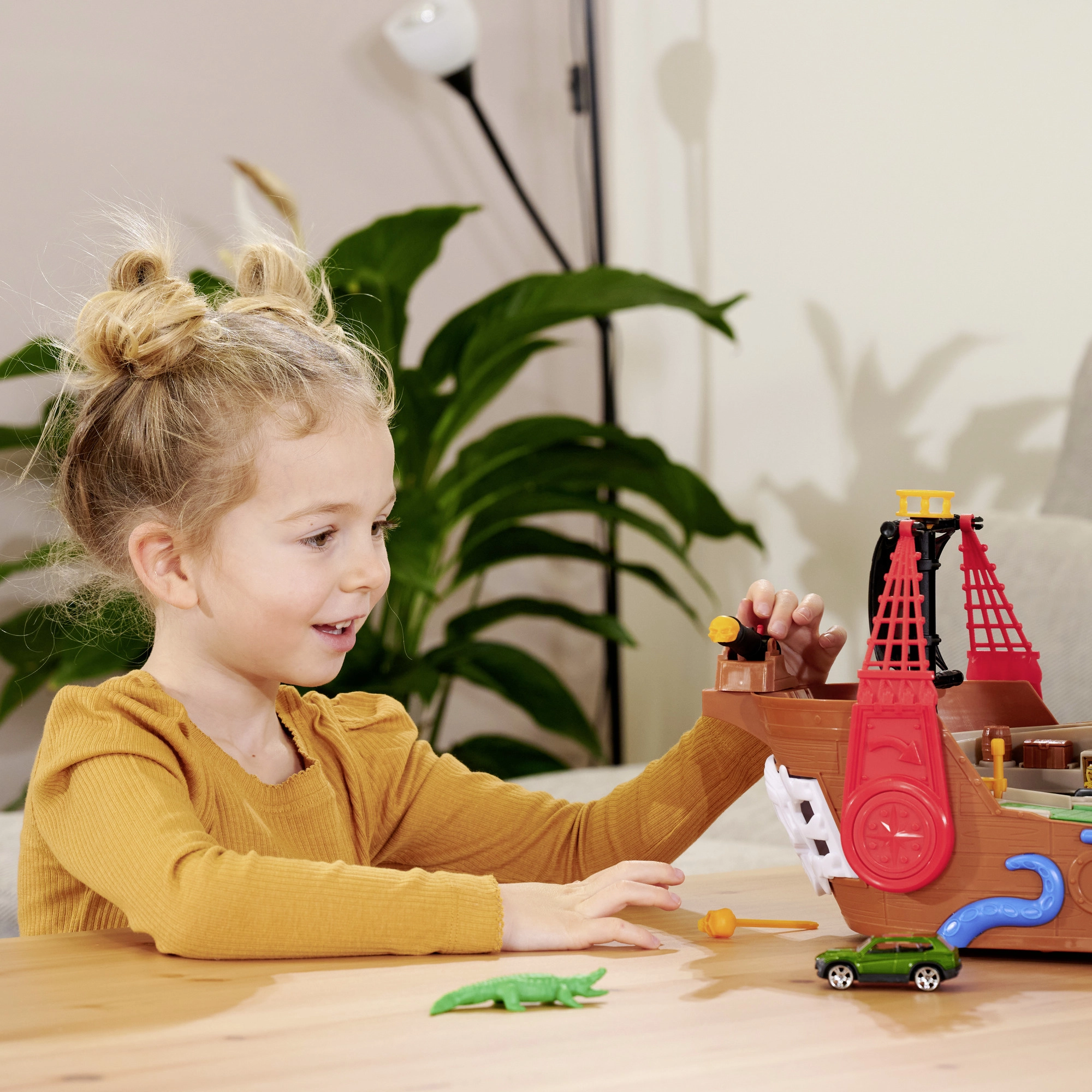 Ez a részletesen kidolgozott kalózhajó igazi szórakoztató központ. A fedélzet felnyitása után feltárul a beépített pálya a fém kisautóhoz, ahol karokkal és kapcsolókkal döntheted el, hogy a jármű átrepül-e a csontvázkapun, a börtönben landol, vagy kilövődik a tutajról. Nem hiányzik a működő ágyú, kincsesláda, hordók, krokodil és további kiegészítők, amelyek ösztönzik a fantáziadús játékot.