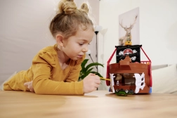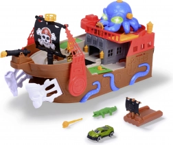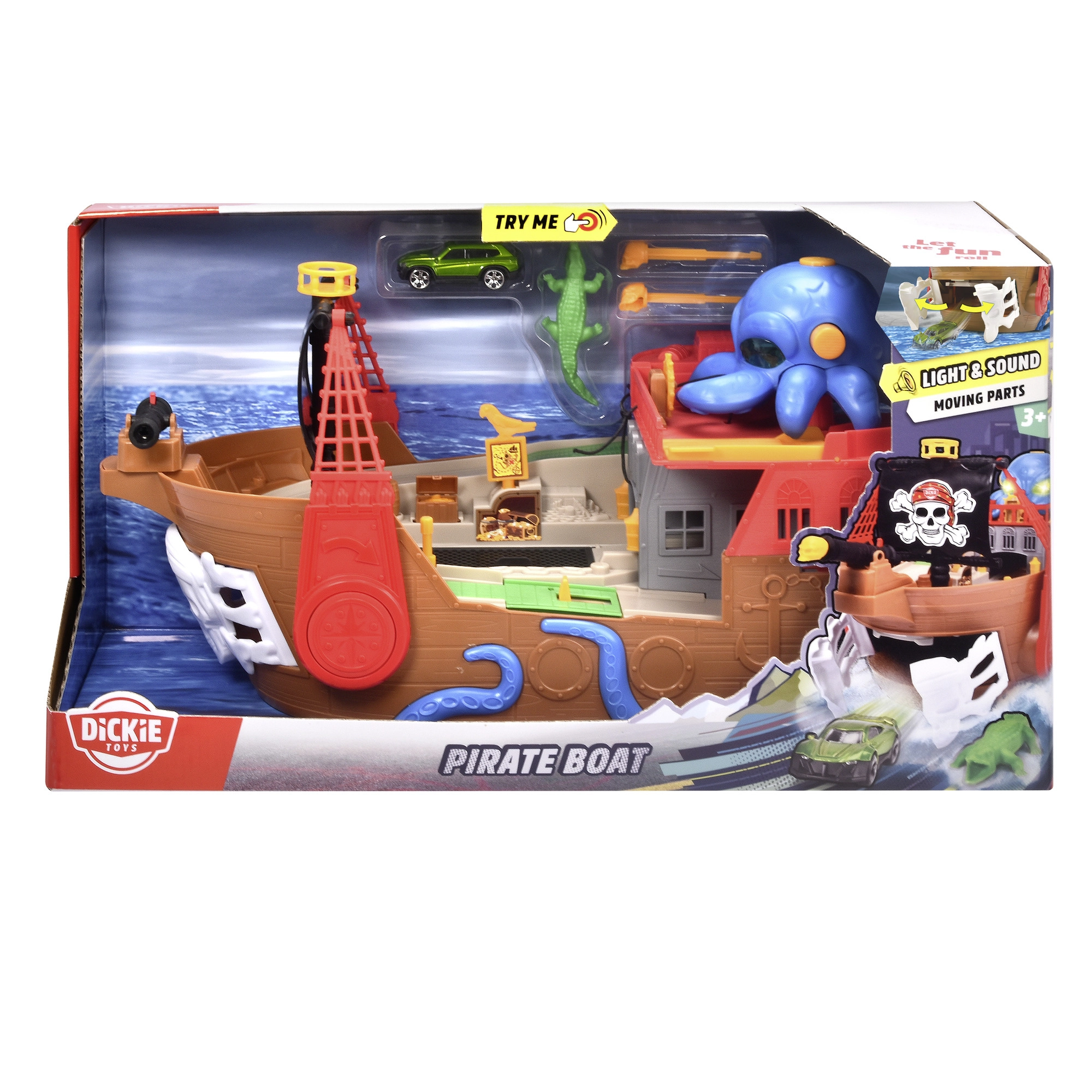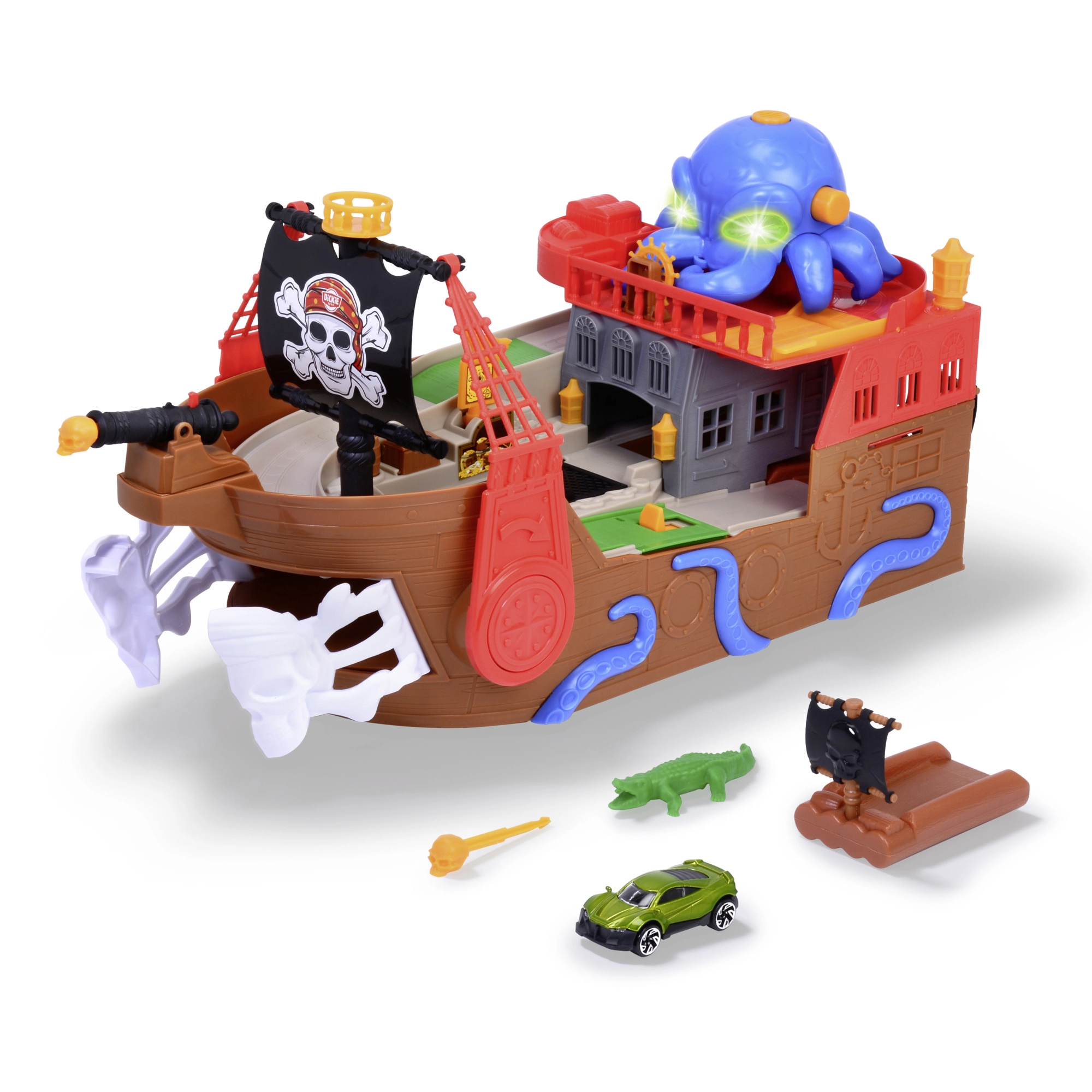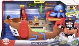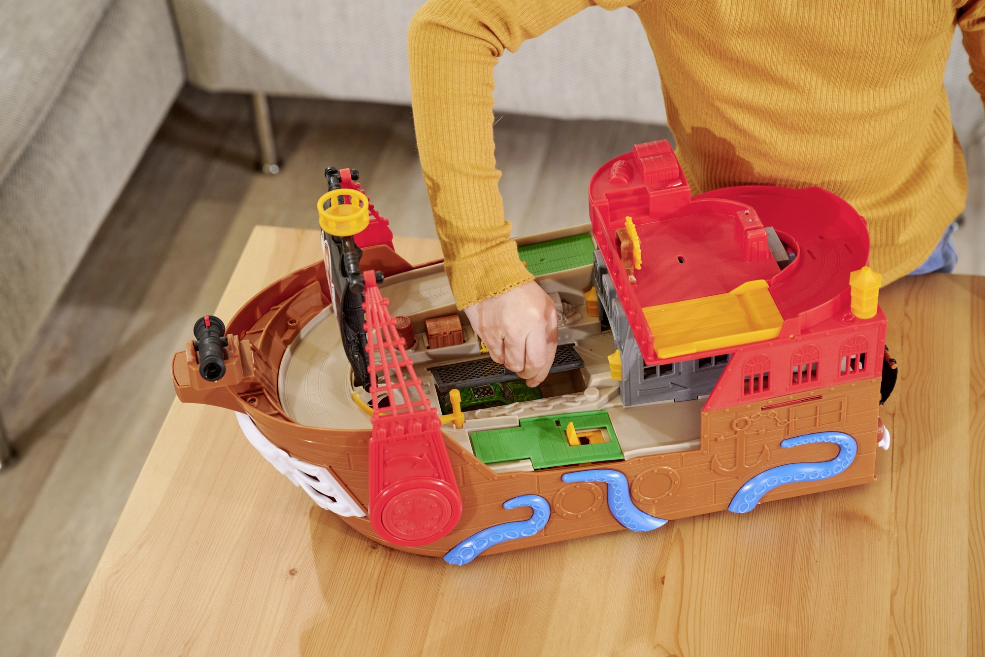 Ez a részletesen kidolgozott kalózhajó igazi szórakoztató központ. A fedélzet felnyitása után feltárul a beépített pálya a fém kisautóhoz, ahol karokkal és kapcsolókkal döntheted el, hogy a jármű átrepül-e a csontvázkapun, a börtönben landol, vagy kilövődik a tutajról. Nem hiányzik a működő ágyú, kincsesláda, hordók, krokodil és további kiegészítők, amelyek ösztönzik a fantáziadús játékot.
