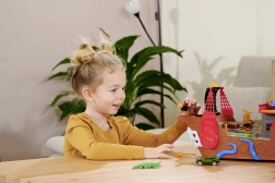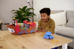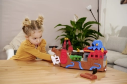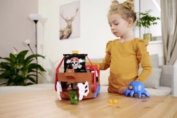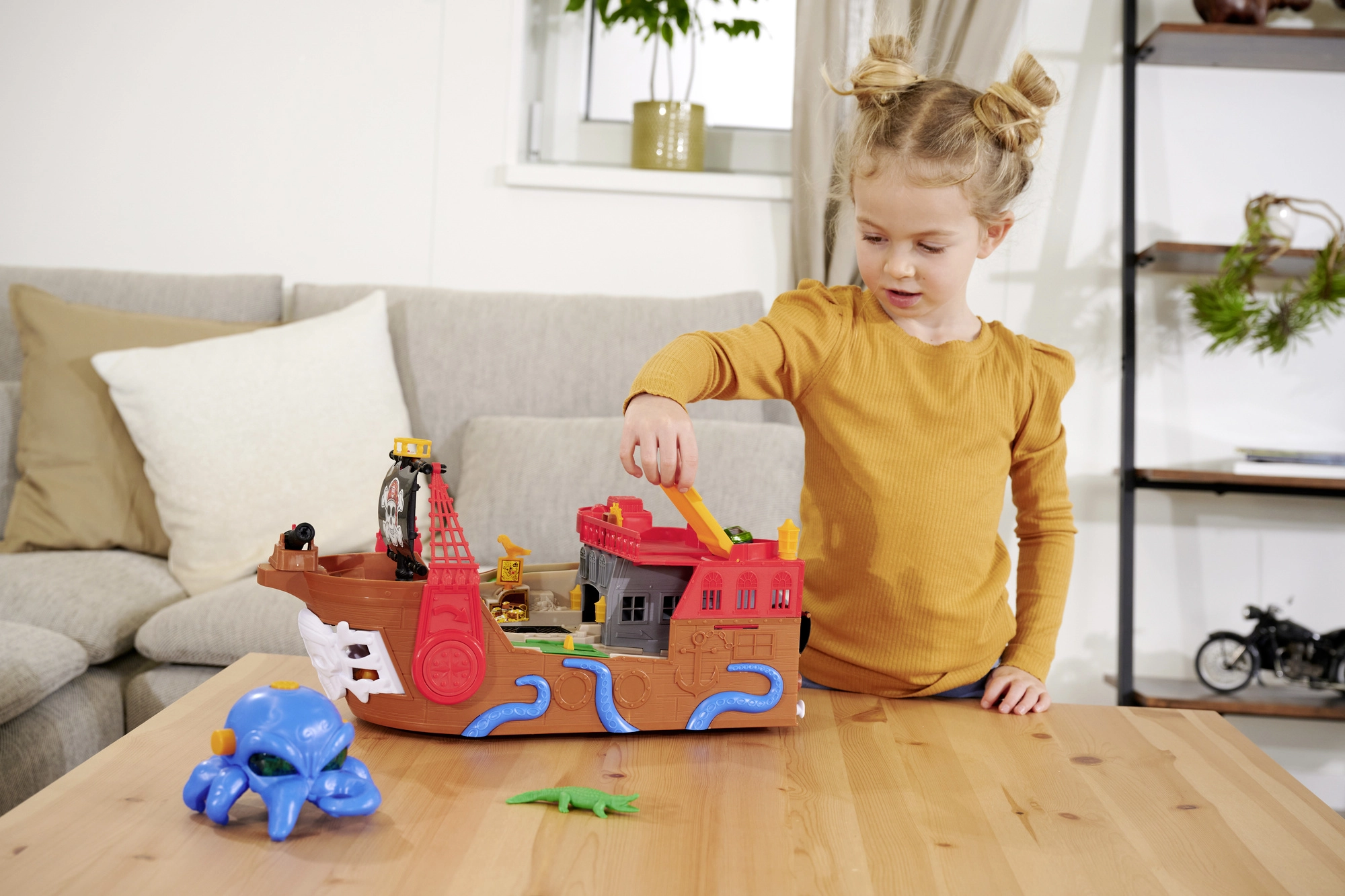 A levehető polip fény- és hangeffektekkel felgyújtja a szemét, és csápjaival „elkapja” a kisautót vagy más elemeket – tökéletes a dramatikus kalóztörténetekhez. A hajó és a tutaj úszik a vízen, ezért ideálisak a kádba, medencébe vagy pancsolóba. Fürdés után az akció a szőnyegen folytatódik a interaktív funkcióknak és a kisautó gördülékeny futásának köszönhetően.