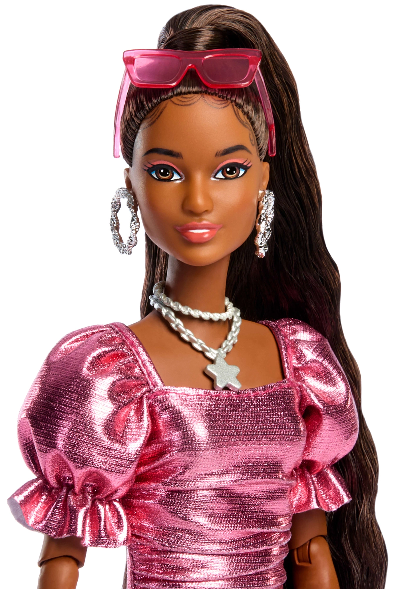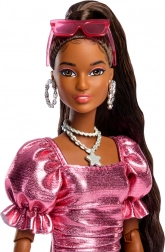 A BARBIE Deluxe Style baba modern megjelenésével és minőségi anyagaival tűnik ki. A fényes, korallszínű ruha látványos alsó résszel, a rózsaszín szemüveg, a karika fülbevalók, a rétegezett nyaklánc és az elegáns kézitáska tökéletes összeállítást alkotnak a kifutóra és a mindennapi történetekhez is. A magas copfba fogott, hosszú sötét haj tovább erősíti a trendi megjelenést.