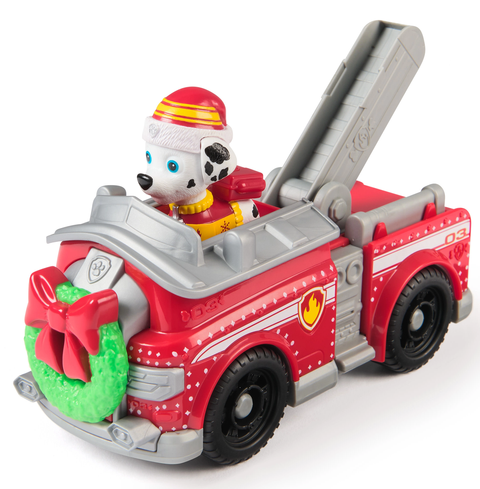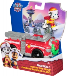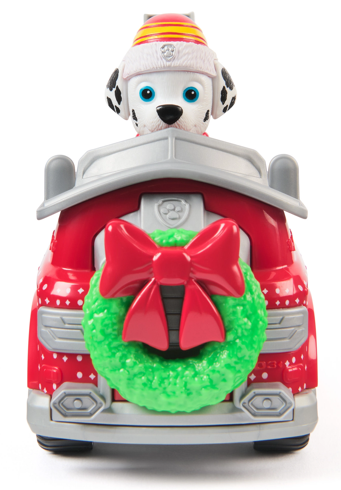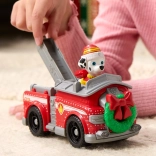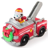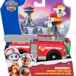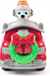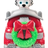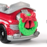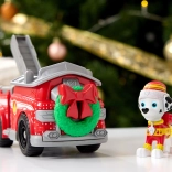 A piros tűzoltóautót zöld koszorú masnival és téli motívumok díszítik. Marshall meleg sapkában készen áll minden téli küldetésre.
