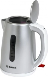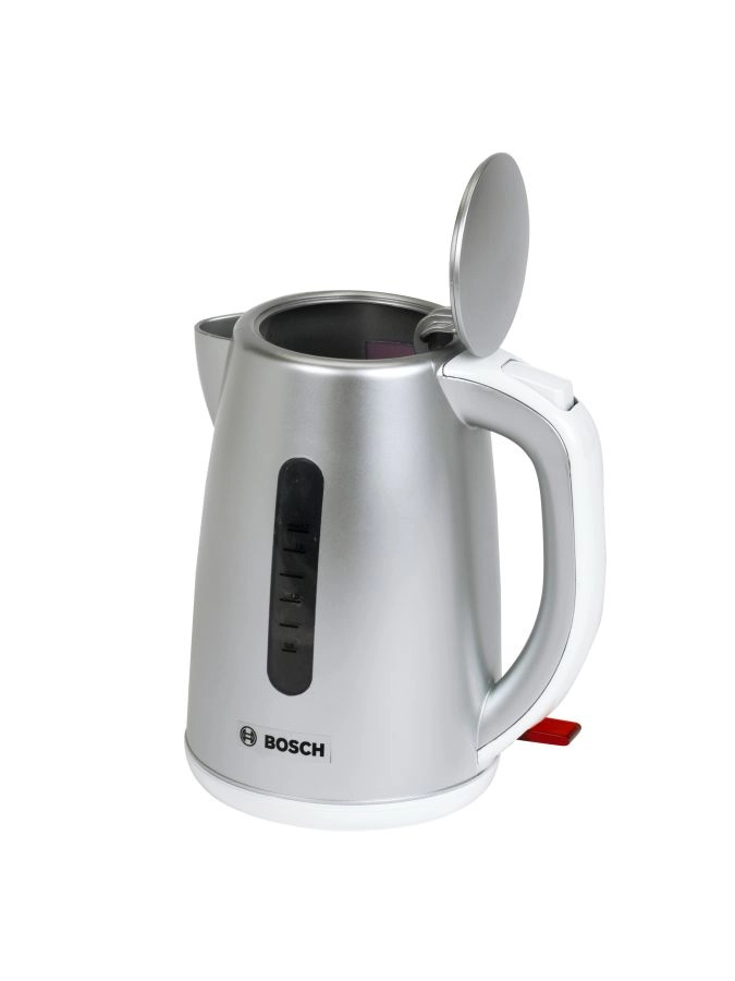 A fémes szürke dizájnú gyerek vízforraló ergonomikus fogantyúval, szintjelző ablakocskával és könnyen nyitható fedéllel rendelkezik, így kényelmes a víz utántöltése játék közben.