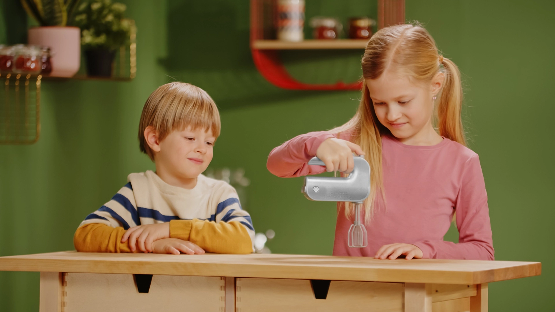 Az ergonomikus markolat, a könnyen elérhető kapcsoló és a habverő kioldó kényelmes játékot biztosít még a legkisebbeknek is.