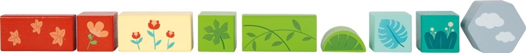 A készletben kockák, hengerek, ívek és nyomtatott elemek találhatók természetes és pasztell színekben, amelyek támogatják a fantáziát és a térbeli gondolkodást.