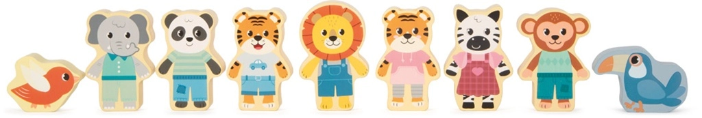 A készlet bájos állatfigurákat tartalmaz – tigris, panda, majmocska, madárka és mások –, amelyek mesélésre és szabad játékra inspirálnak.