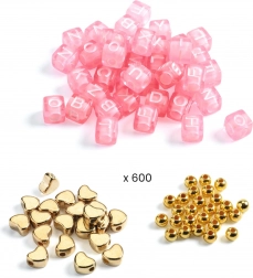 Elegáns, kreatív készlet betűgyöngyökkel személyre szabott karkötők és nyakláncok készítéséhez. A gyerekek könnyedén kirakhatják a neveket vagy üzeneteket, és eredeti ékszereket alkothatnak arany színekben. Remek választás a finommotorika, a kreativitás fejlesztésére, valamint ajándéknak kis alkotóknak.